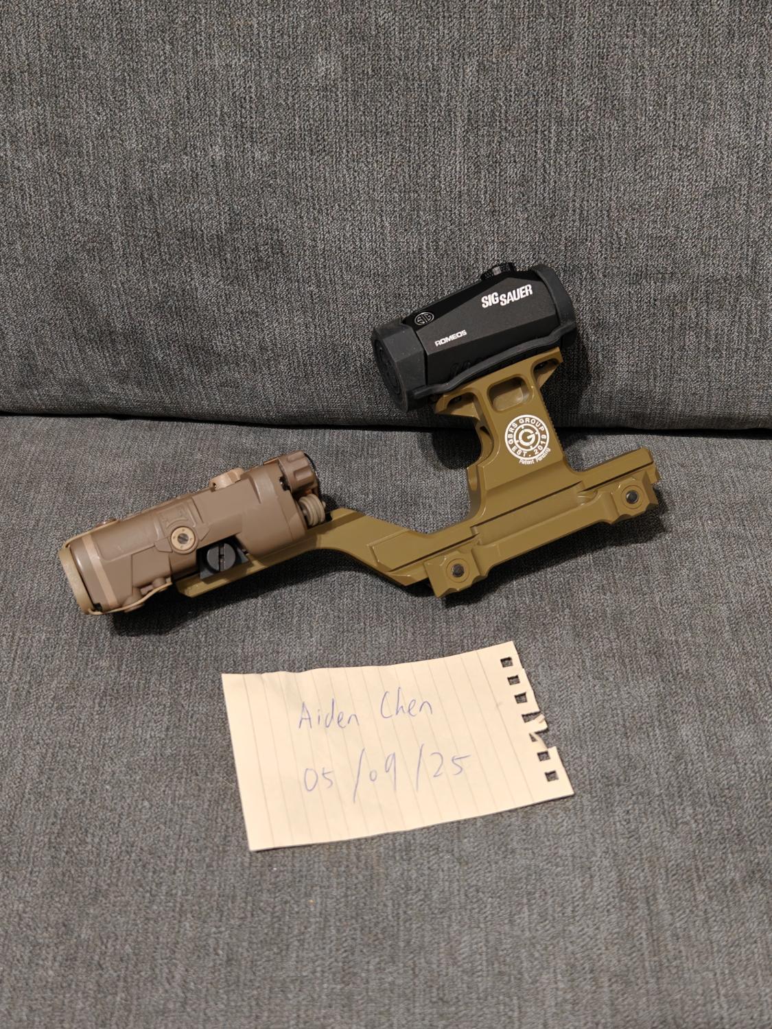 Comes with a repro SIG Sauer Romeo 5 red dot and a PEQ NGAL laser and flashlight by FMA. This is among the highest quality of PEQ replica available. Both fully working and in very new external conditions.