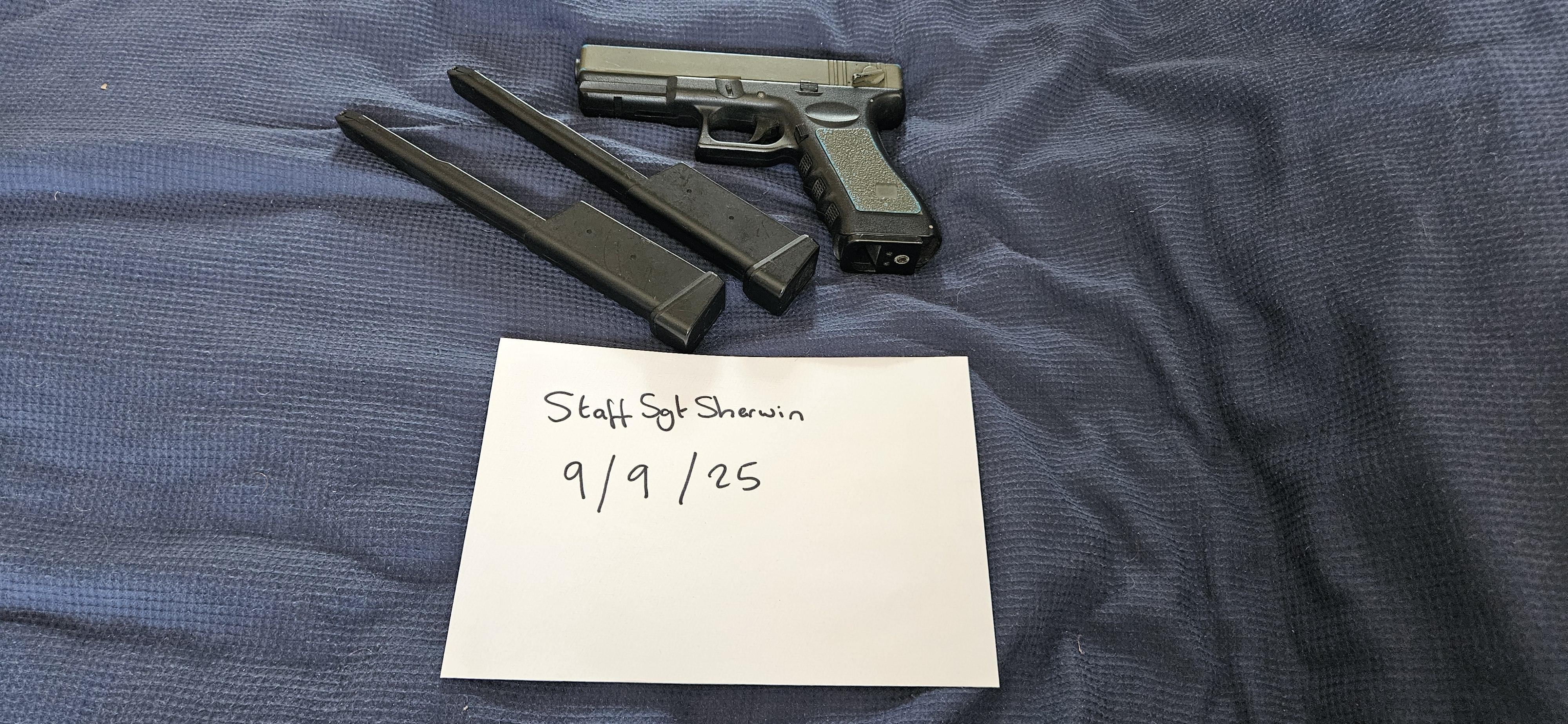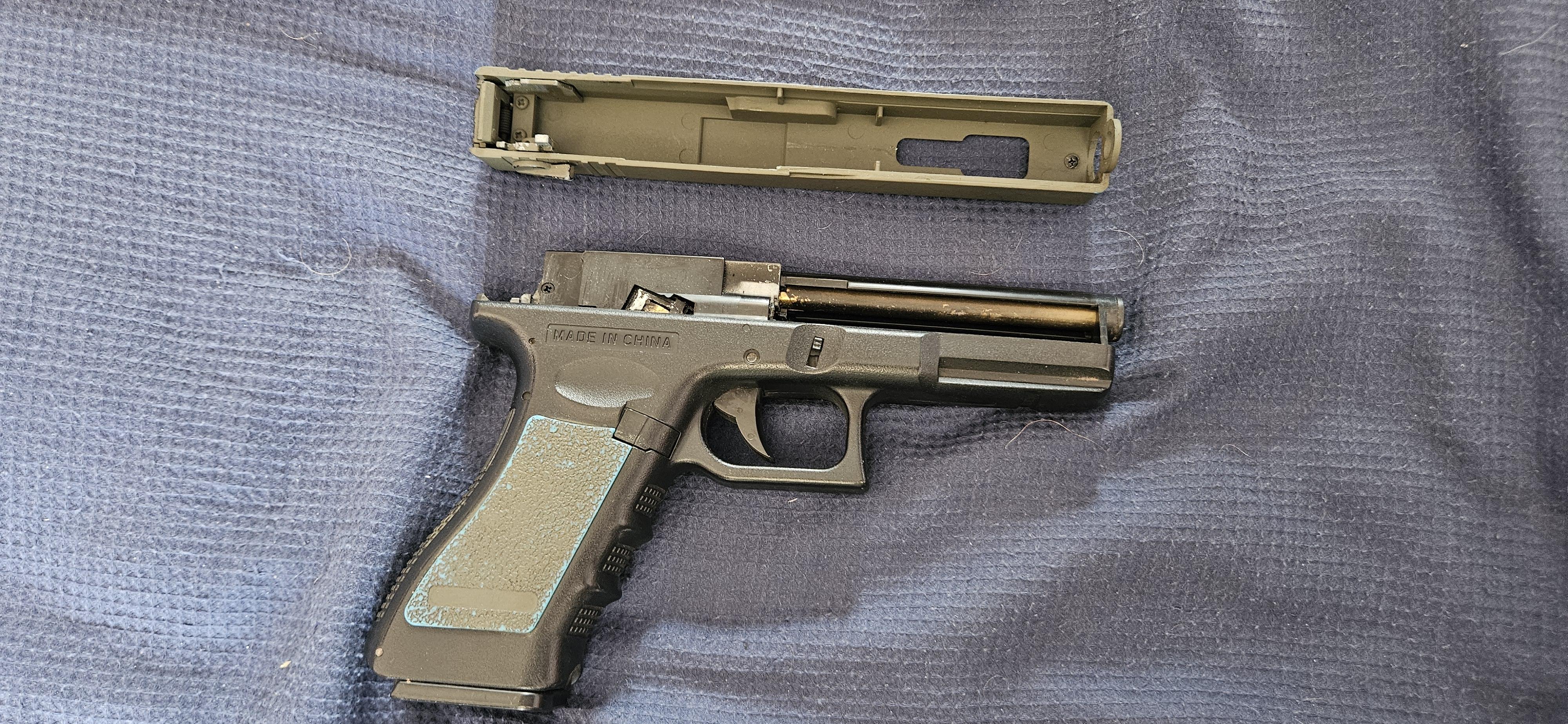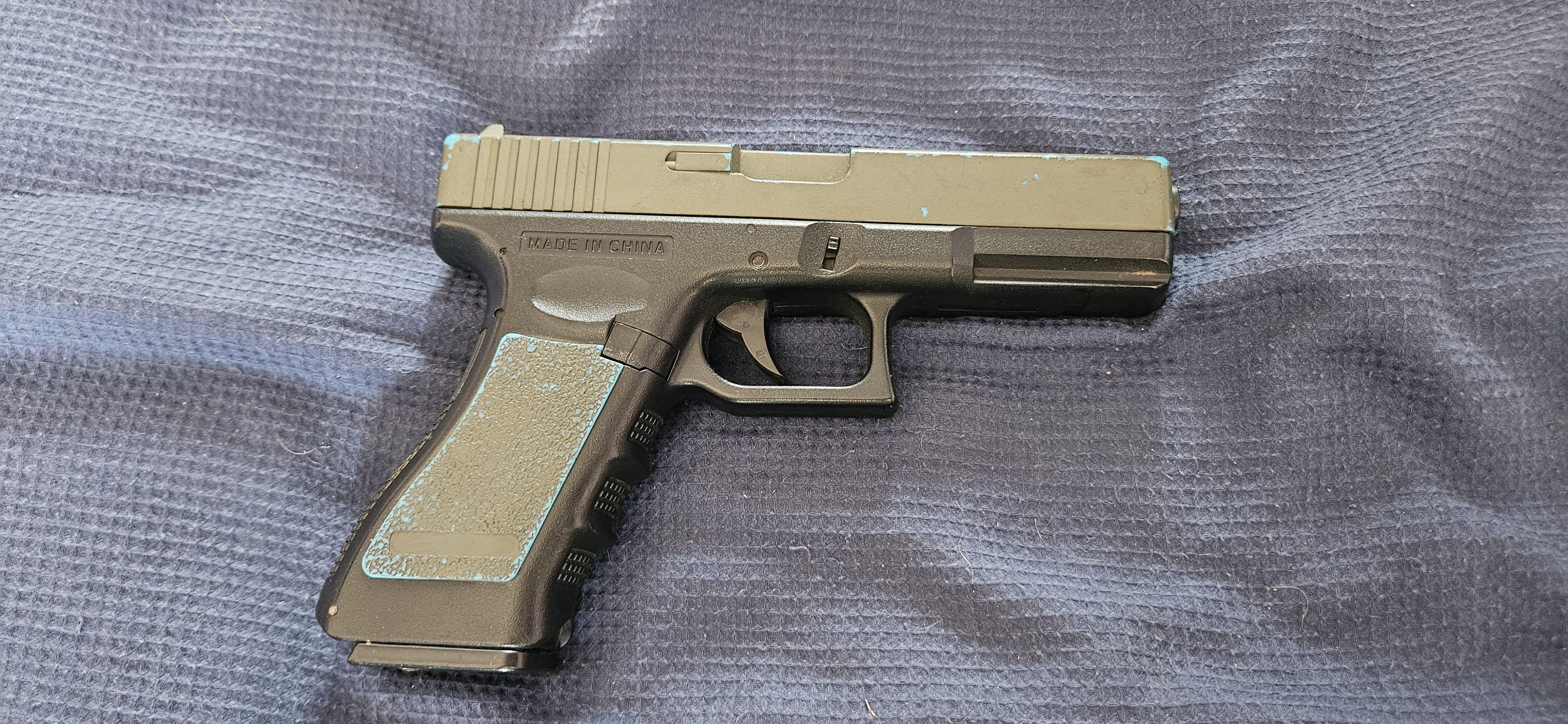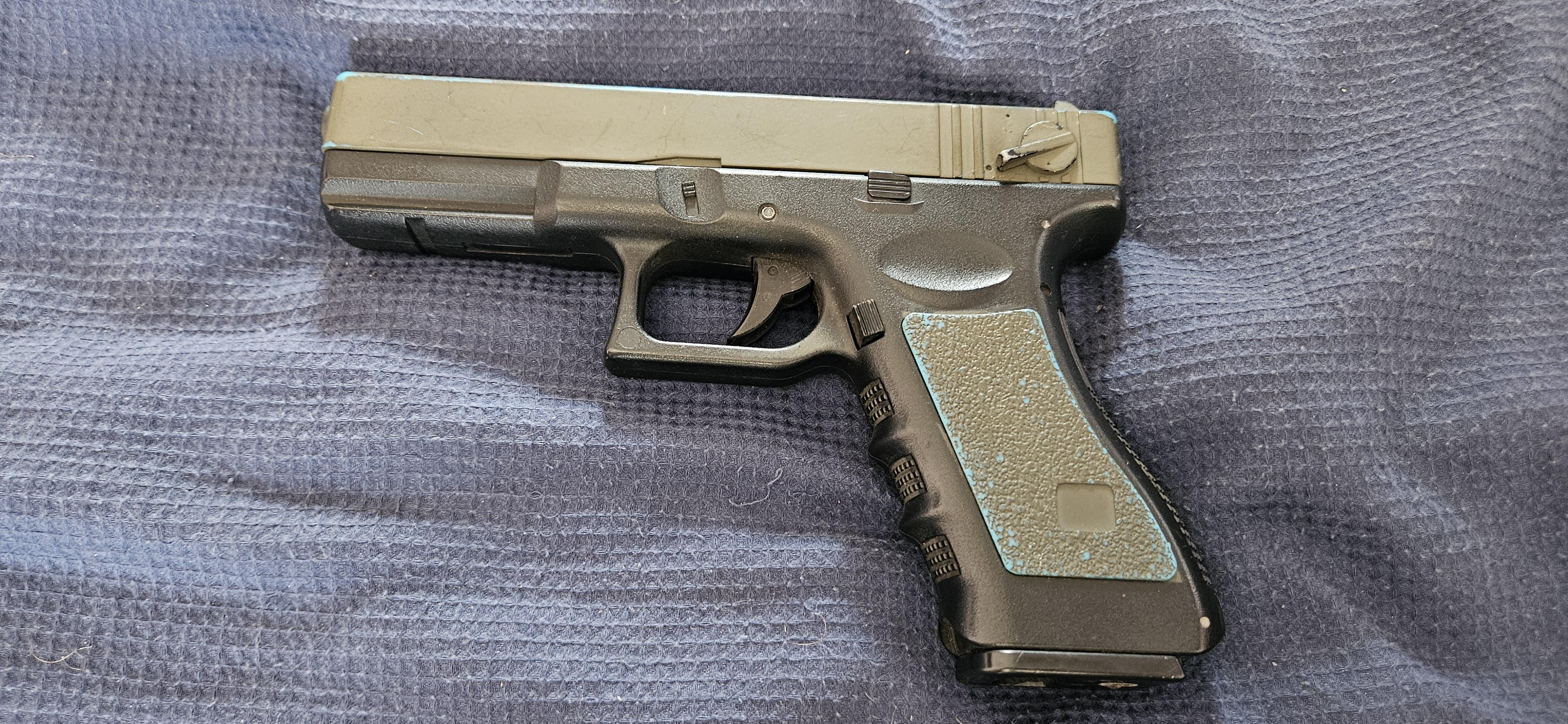 CYMA Glock AEP is two tone blue but has been krylon spray painted green in its past life