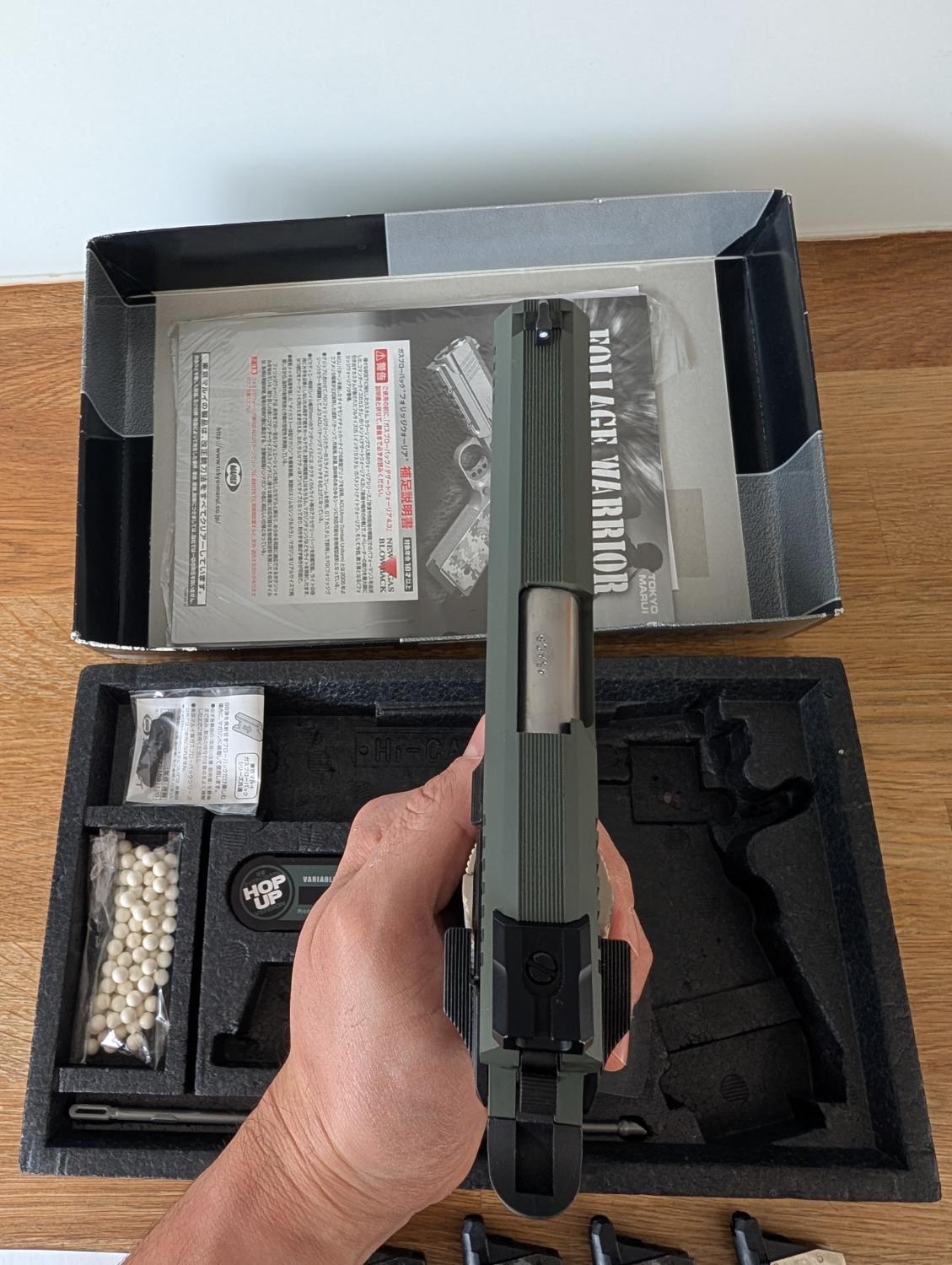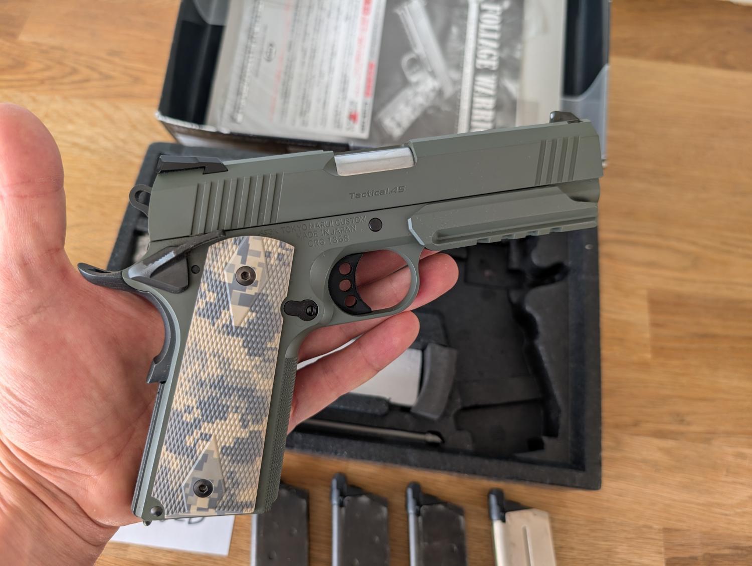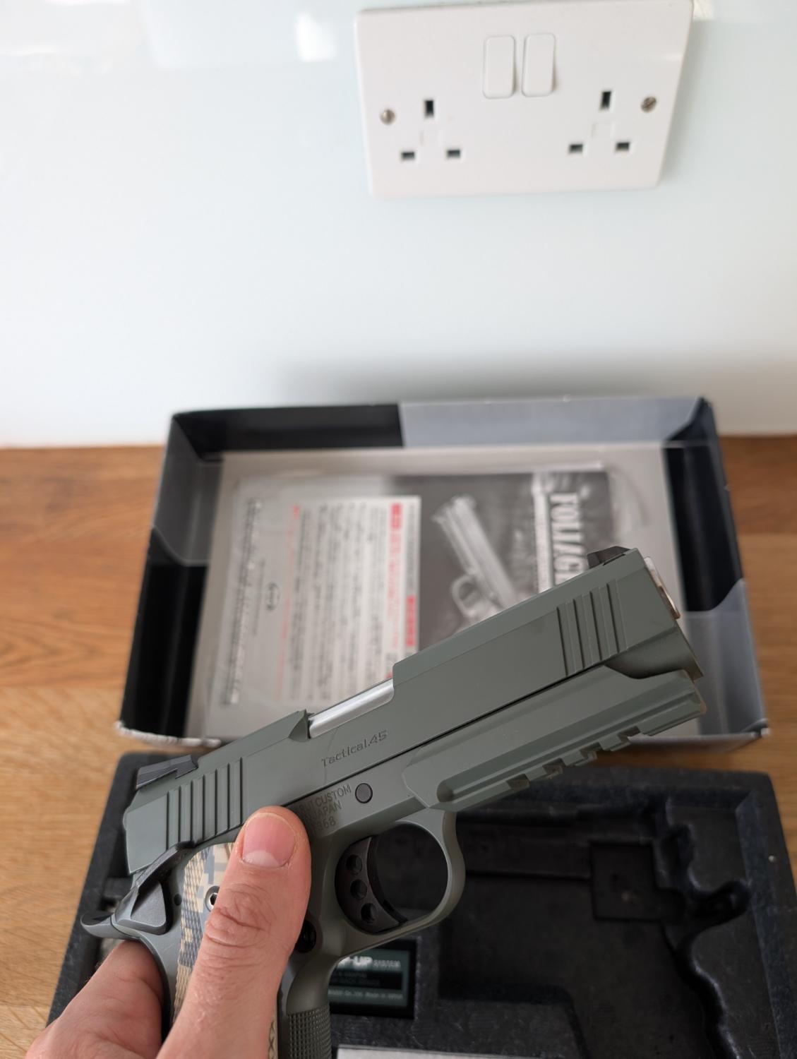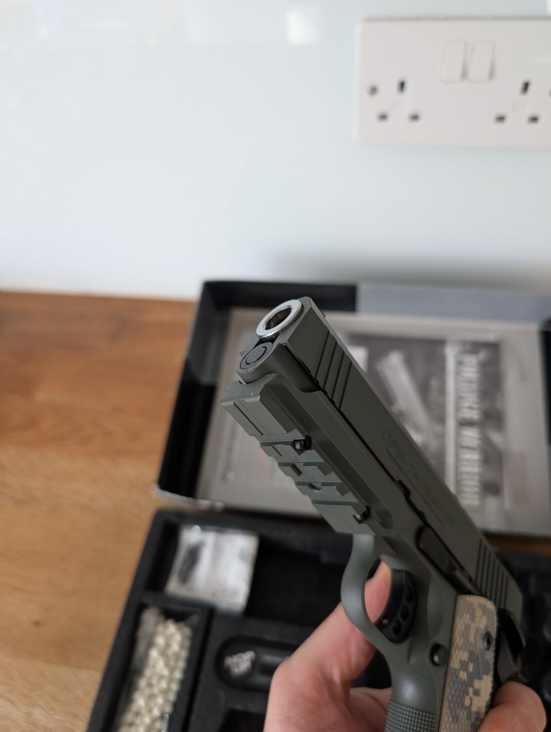 Selling up as I have too many pistols. All four mags are leak free, one of the mags has a little (extraneous) bit of metal missing off the base plate. The gun is nice and snappy, exactly as you'd expect from TM. Excellent condition pistol. There's a very subtle mark on one side of the gun, but its superficial, no damage or gouges.