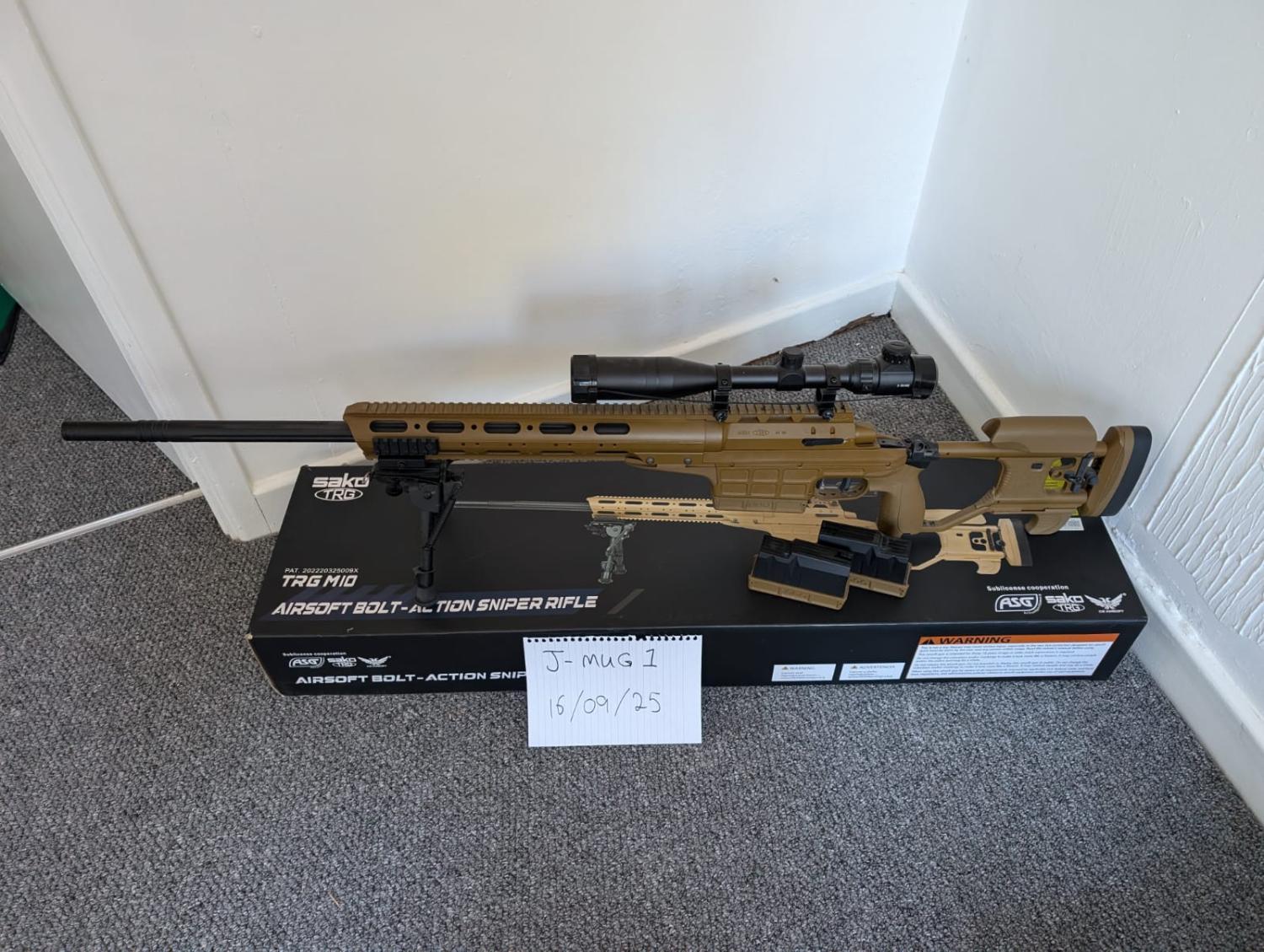 I have here my essentially NEW ASG SAKO TRG M10 Airsoft Sniper Rifle, Tan. This is a heavy piece of kit but its gorgeous to look at, but I don't use it and it's never been fielded. I've treated it as more of a beautiful wall hanger really. It's essentially new for this reason, but have a look at the photos as there are some scuff marks around the bolt catch (used to open it up/change spring) which you'll find impossible if you do try!