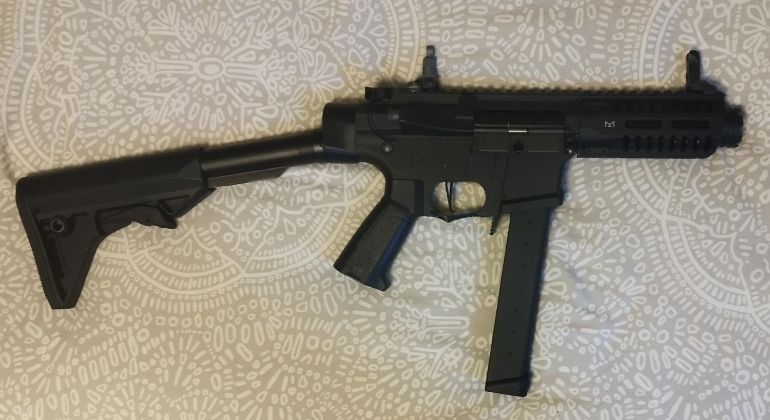 G&G ARP9, installed with an angled stock. Comes with original stock and hi-cap mag. Needs a bit of TLC.
