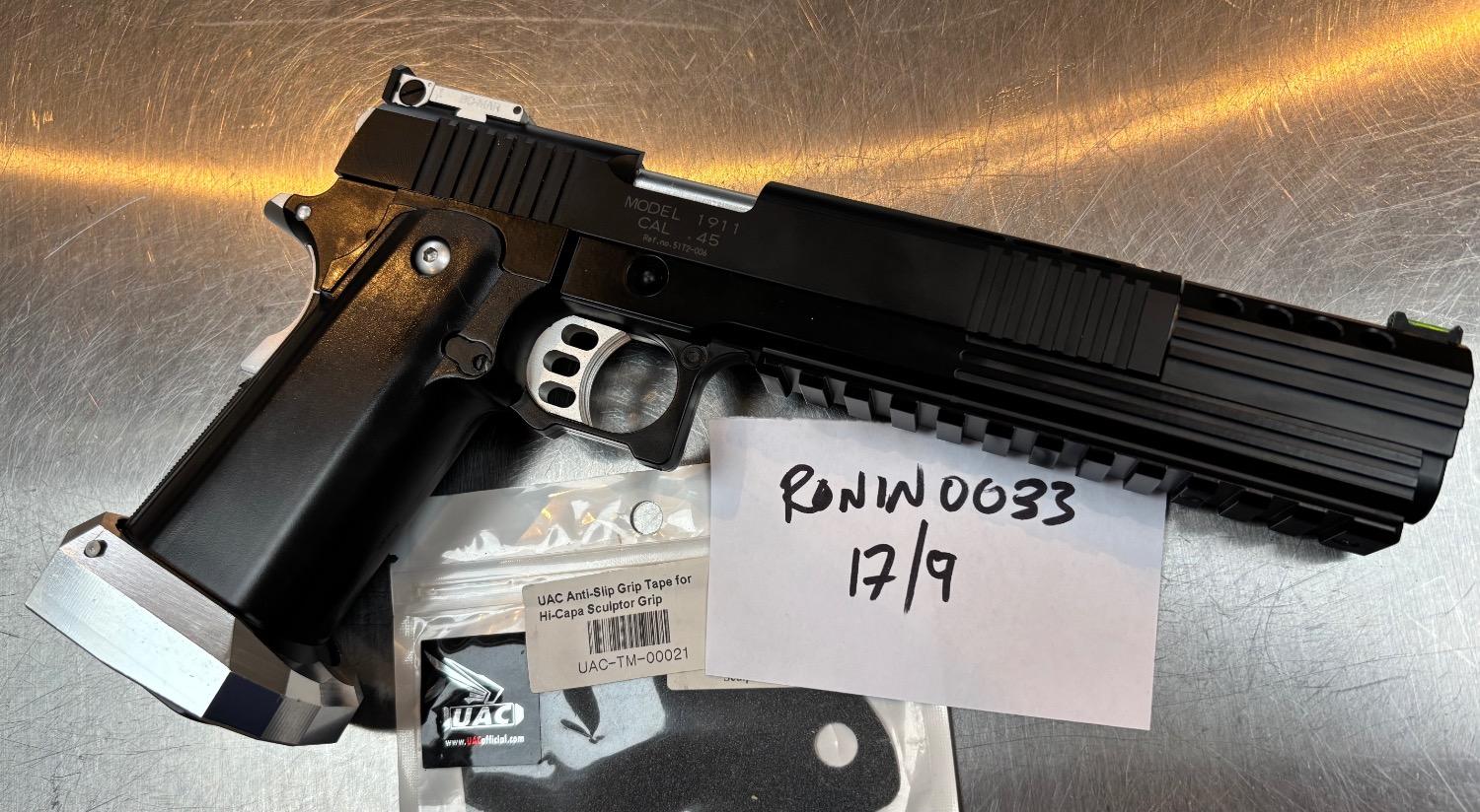 Consists of a Nineball frame (not one of the standard 7” ones), matching compensator, custom polymer slide, trigger, safety, beavertail, and hammer (possibly sears, but I can’t be sure).