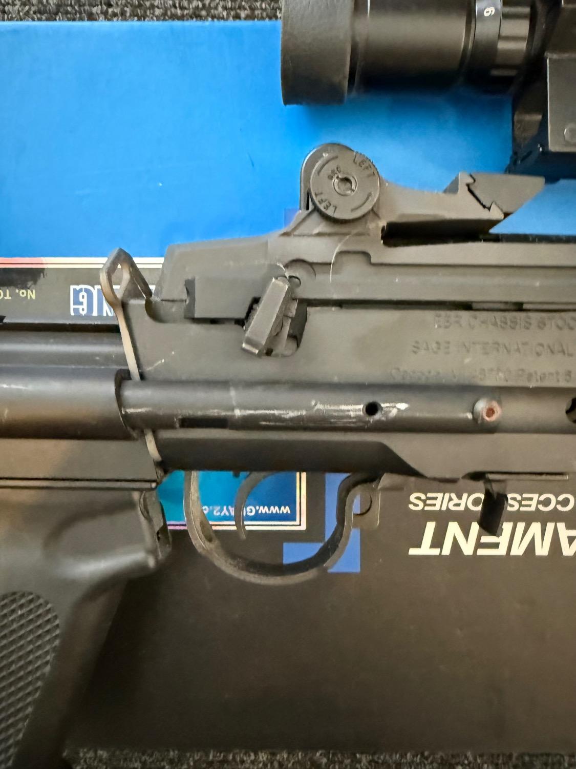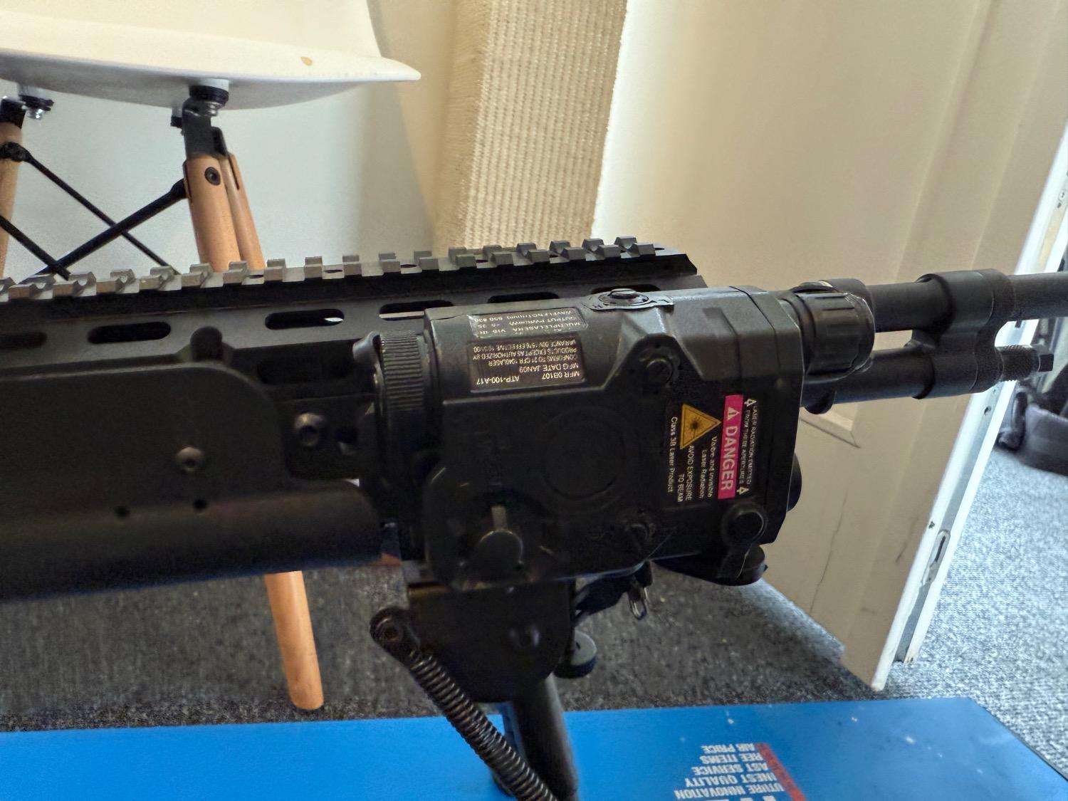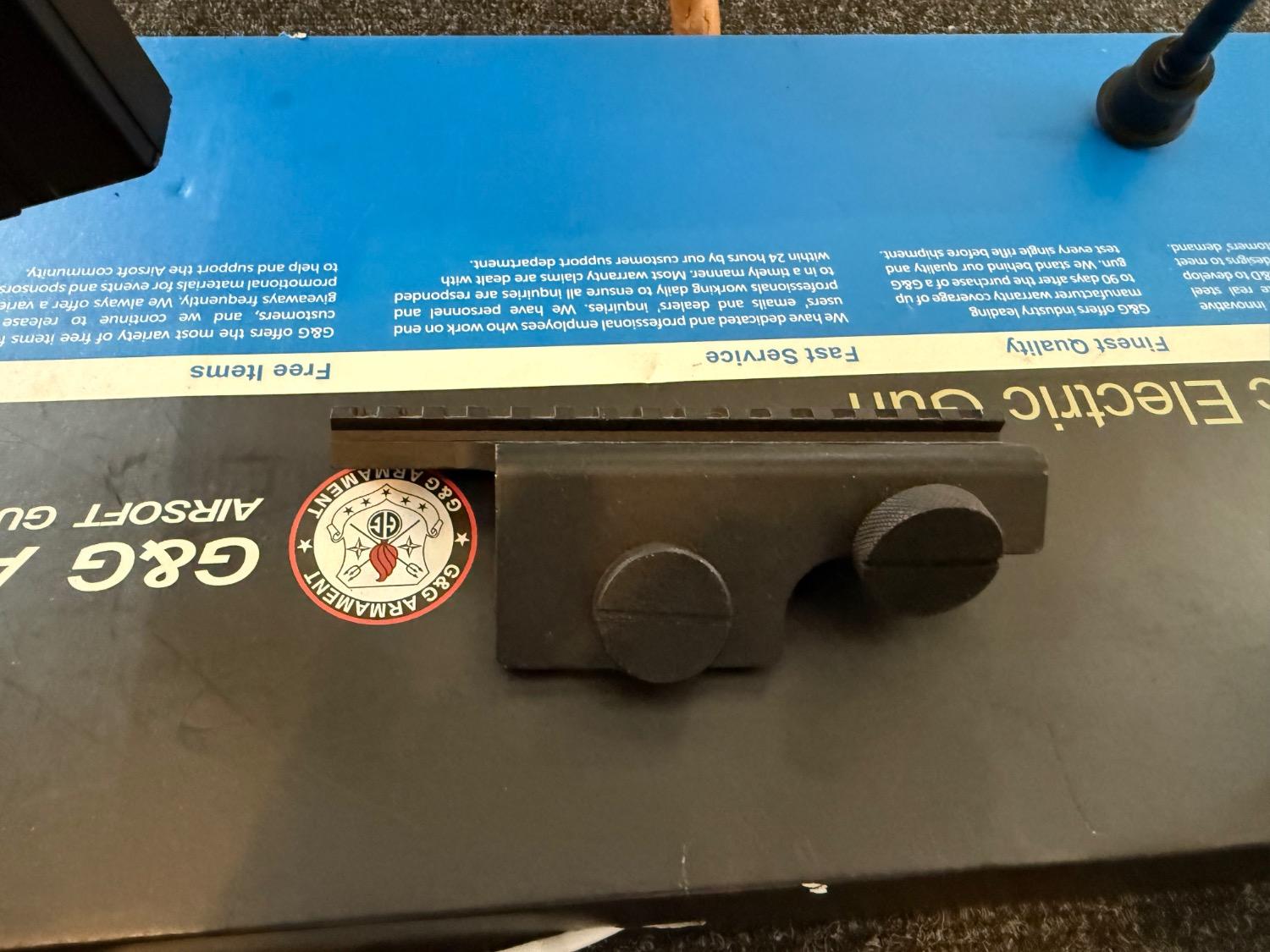Scope, PEQ Battery box, Harris style bipod, one magazine and Tamya to Dean’s adapter as well as official scope adapter and rail riser/extender.