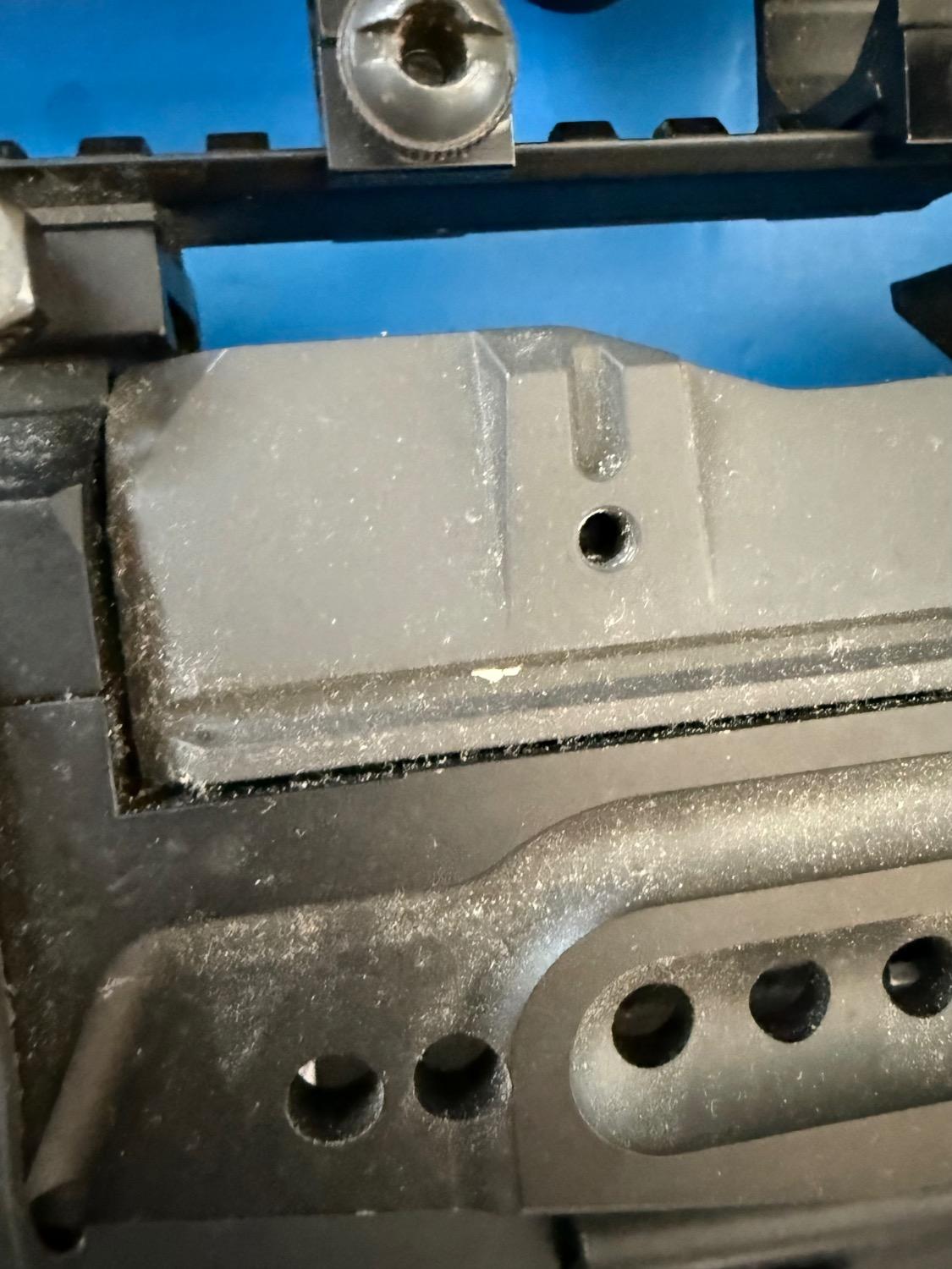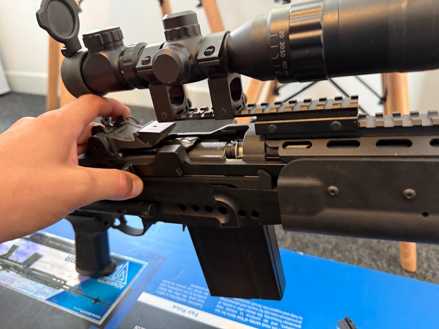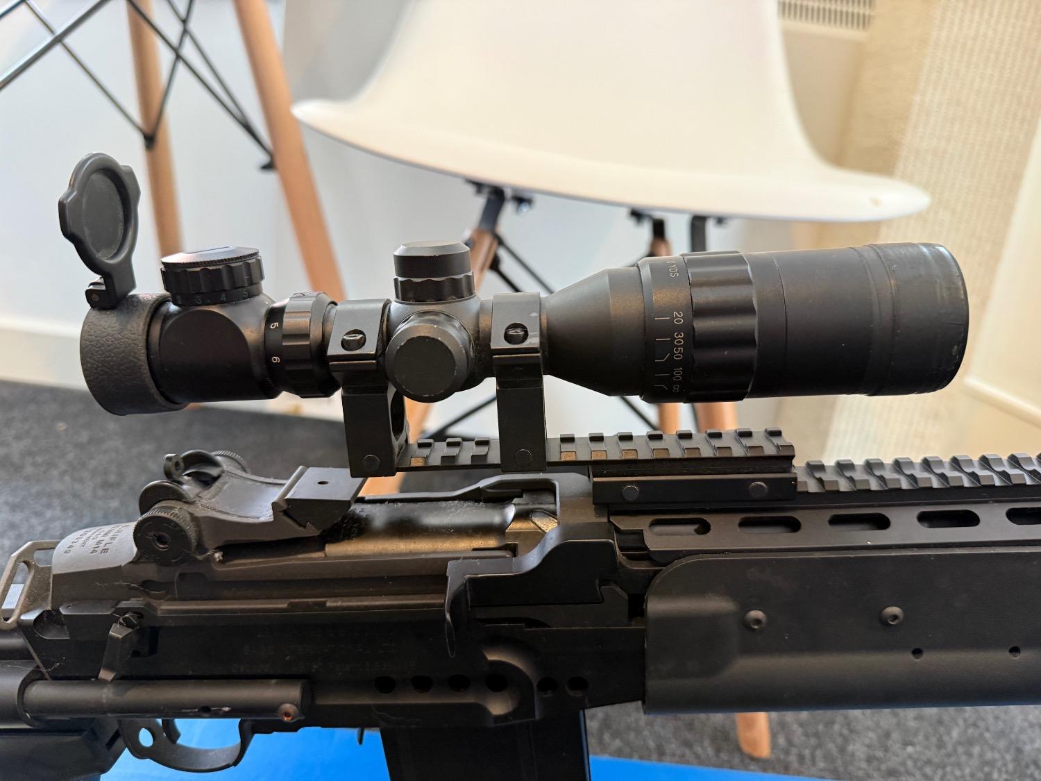 Scope, PEQ Battery box, Harris style bipod, one magazine and Tamya to Dean’s adapter as well as official scope adapter and rail riser/extender.