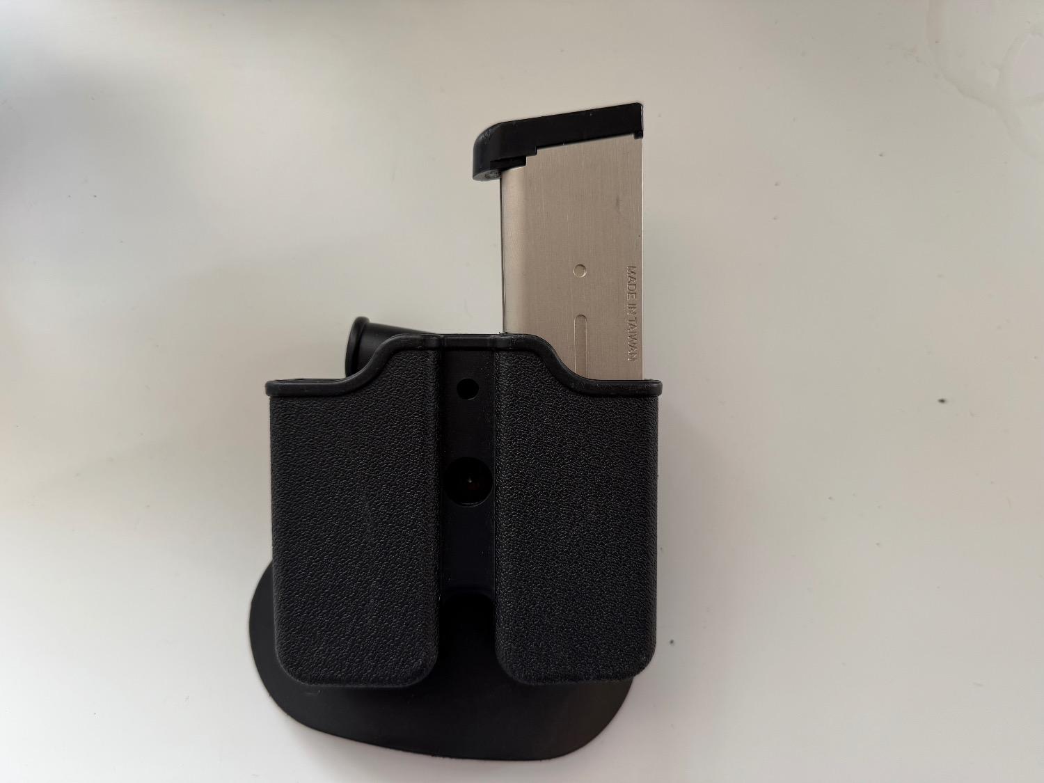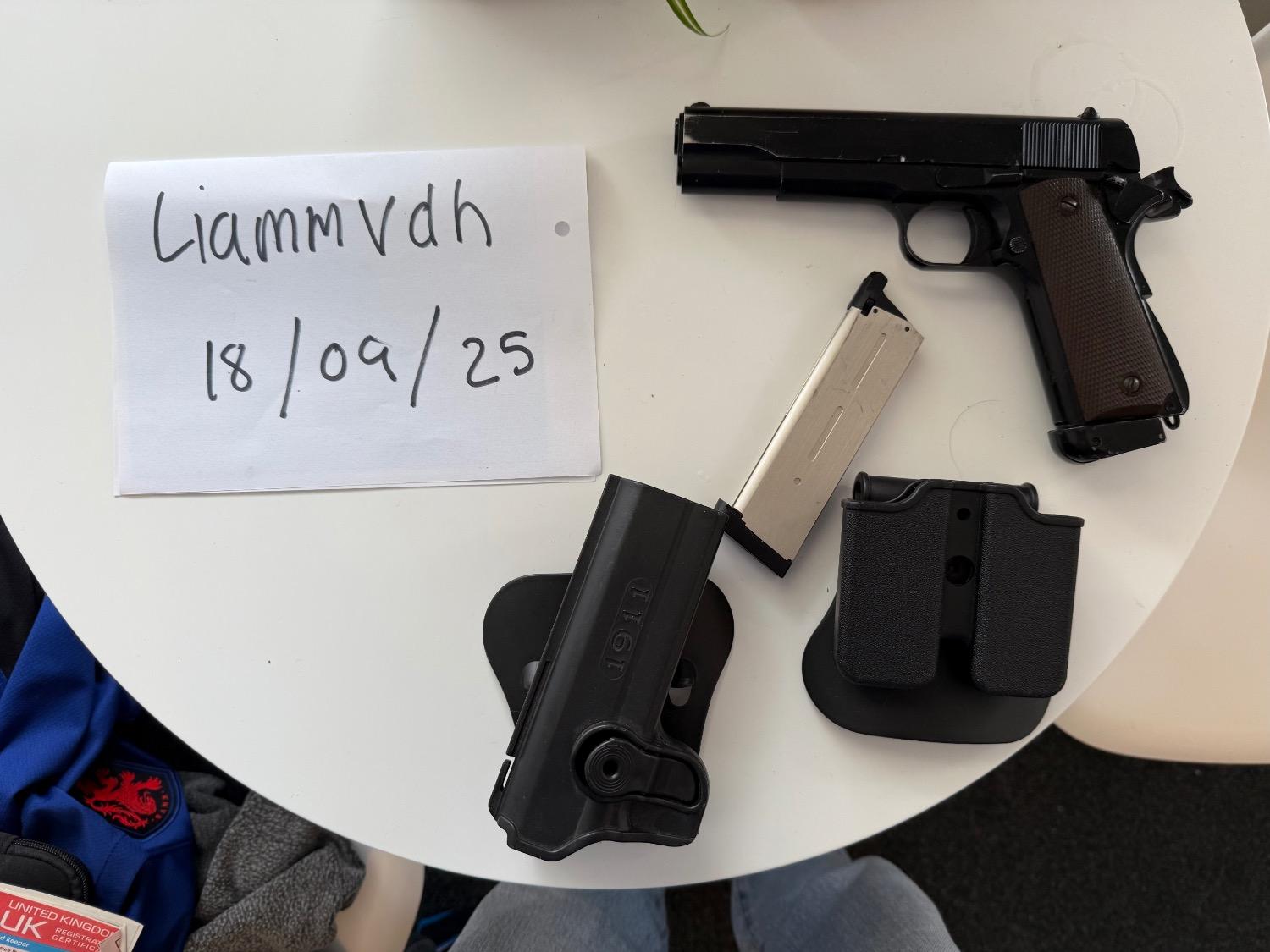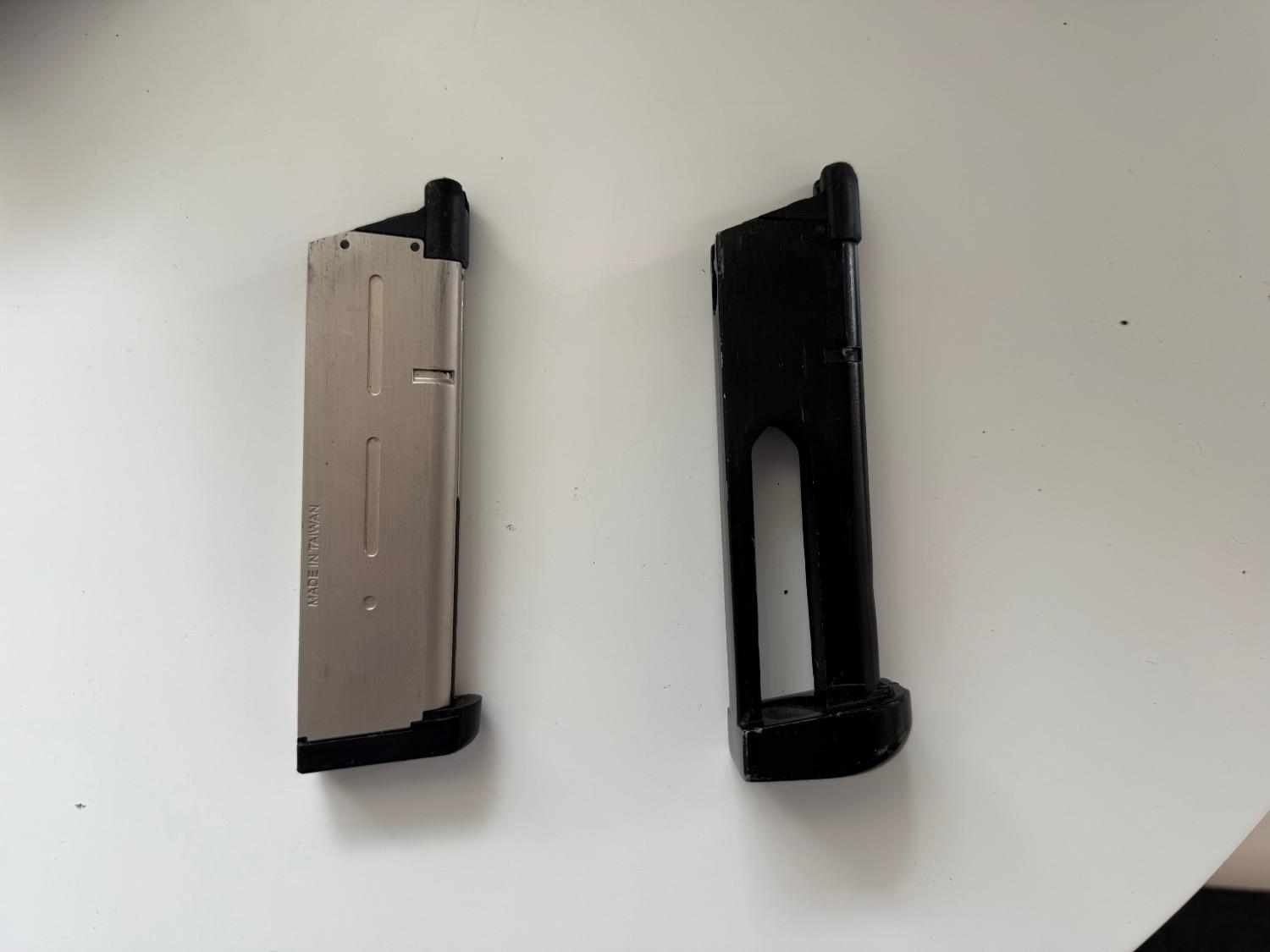KJ Works 1911 classic gas blowback with a hip moulded holster, two magazines, one green gas (needs new o-rings, I think) and one CO2, and a hip moulded holster for green gas magazine. Had for many years and has signs of wear, but good gun.