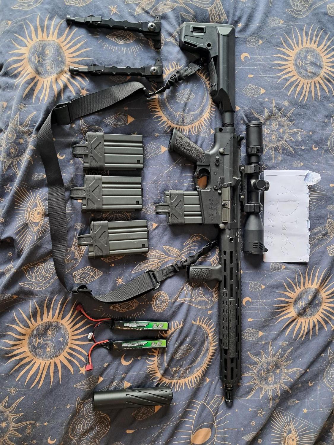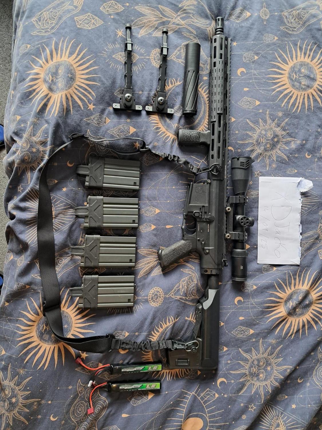 Rare DMR: SR25 Knights Armaments package by G&G. Very reluctant sale as I love this rifle and had big plans for it. It has real embossed markings, is Semi only, fully ambidextrous, all 4 midcap mags have followers to spit out all the bbs inside and when the mag is empty, it stops shooting.