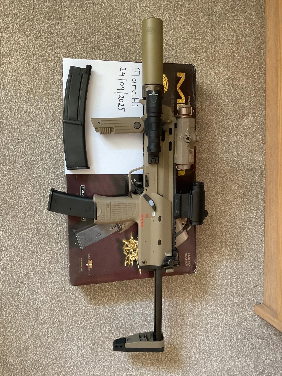2 magazines, peq laser, flashlight, suppressor, sling point.