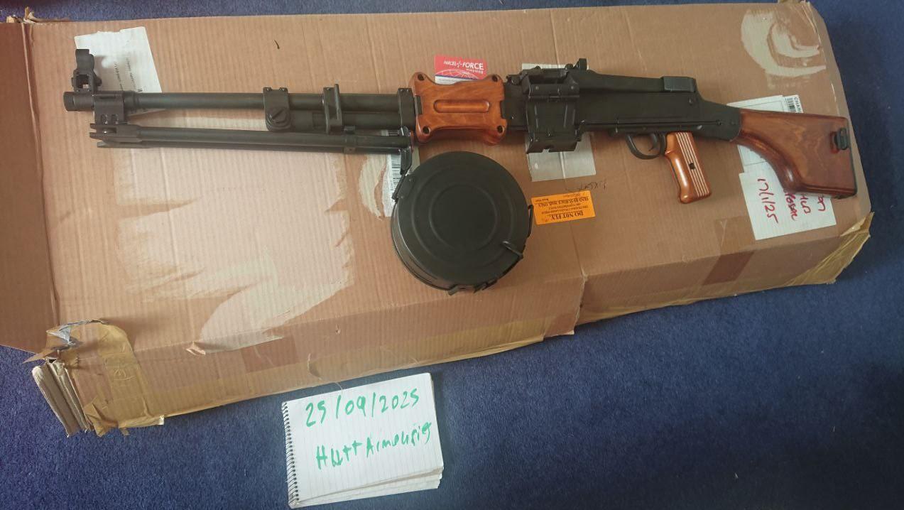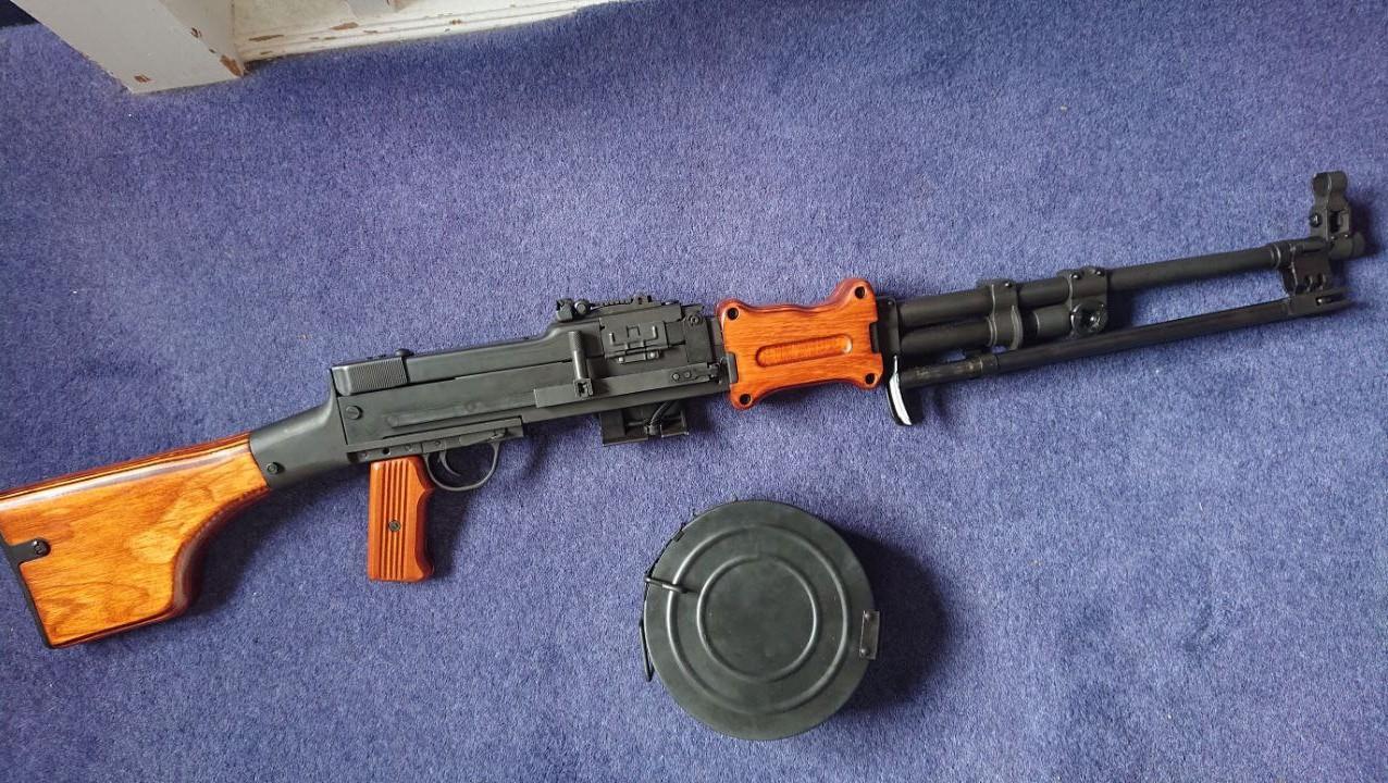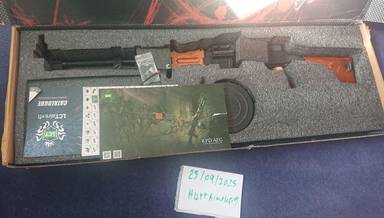 An as far as I can tell as new lct rpd machine gun. The box has been turned inside out for shipping at some point and taken some damage but the gun itself is in perfect nick. I have test fired it and tested the function of the drum mag and its all working as it should. Comes with the original paperwork, keychain thing and a spare set of trigger contacts as well as the gun and drum. Unfortunately my chrono kicked the bucket so I dont have a way to measure the power but by eye it seems fine. Will consider reasonable offers.