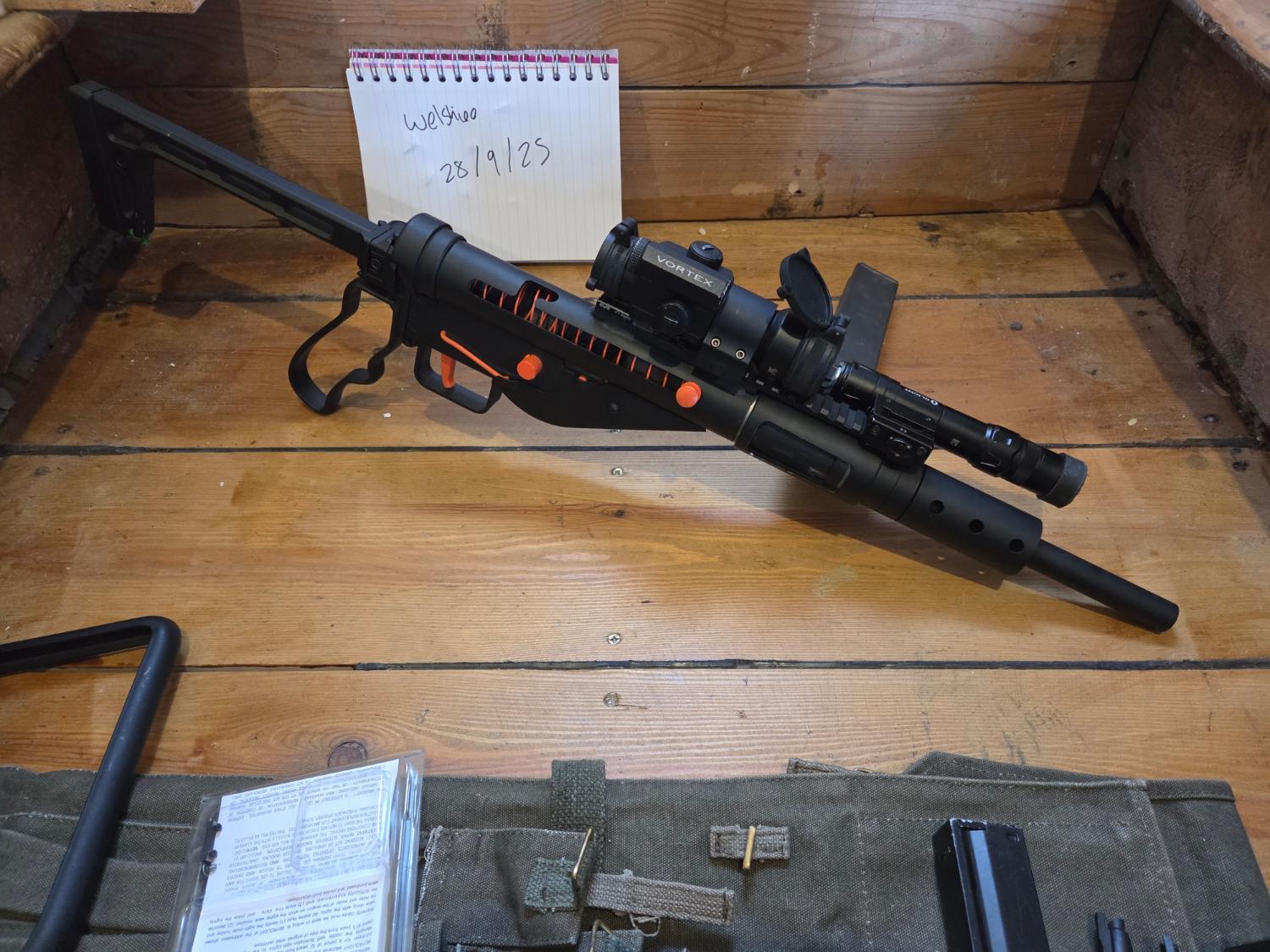 It started life as a Northeast sten but I wanted something more modern so I milled a rail from steel and welded it onto the body, at the back end i machined a cutout for a mepro tritium sight to act as a backup.