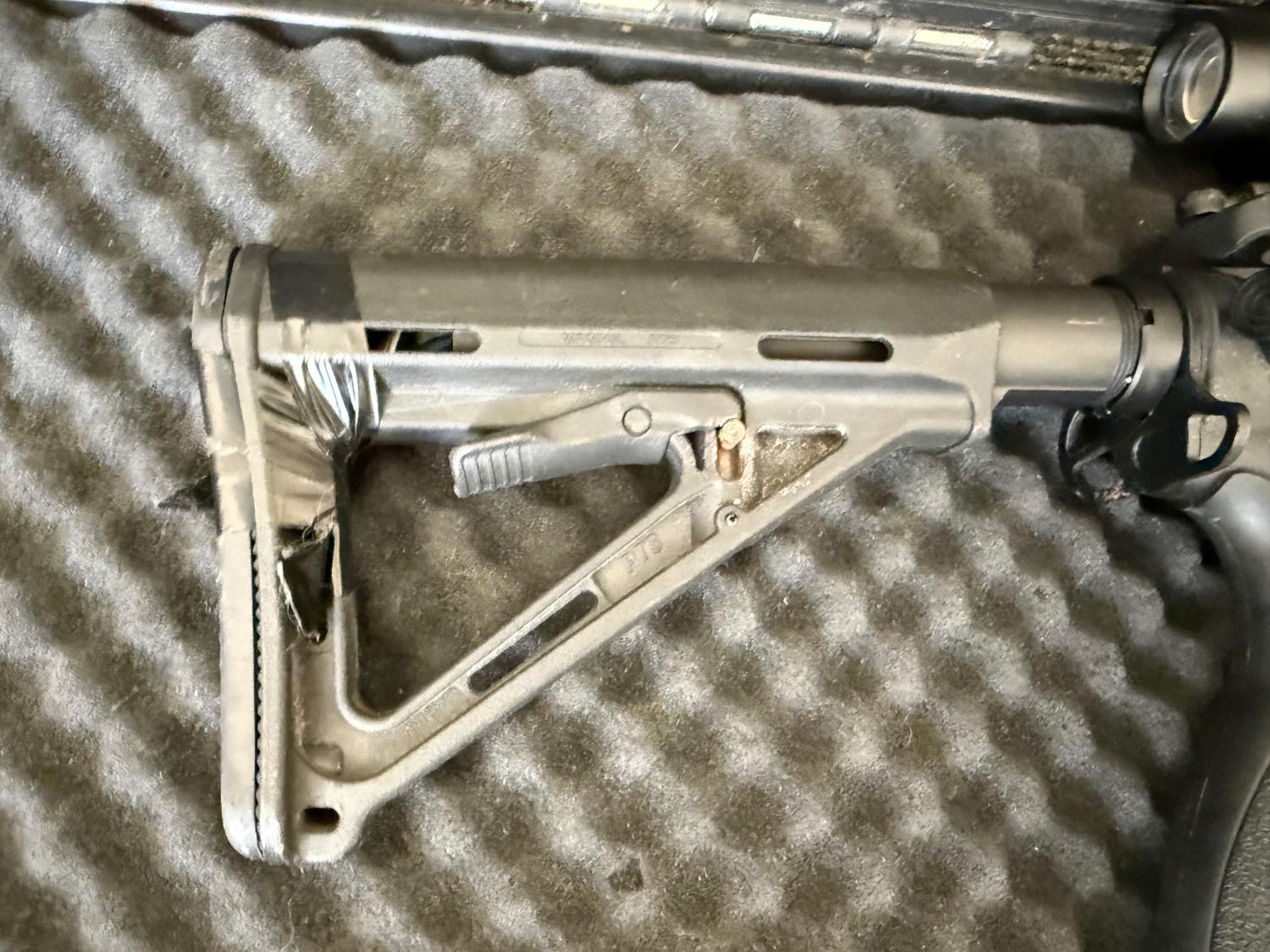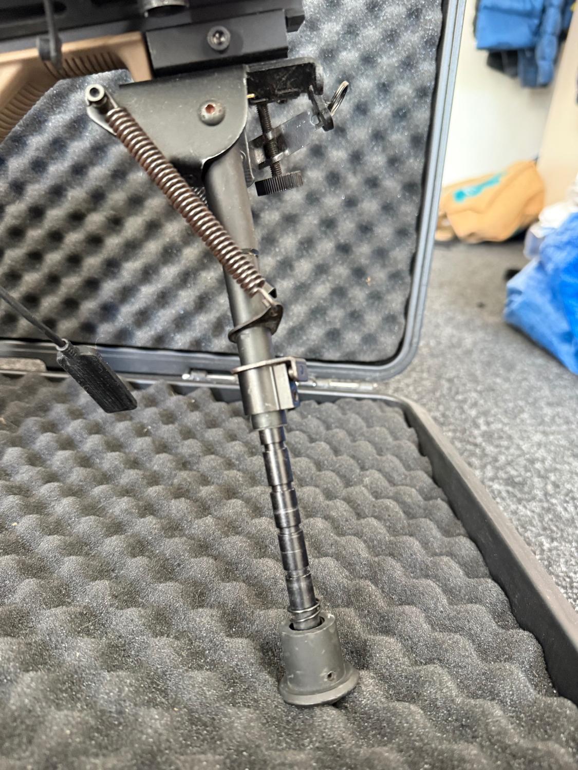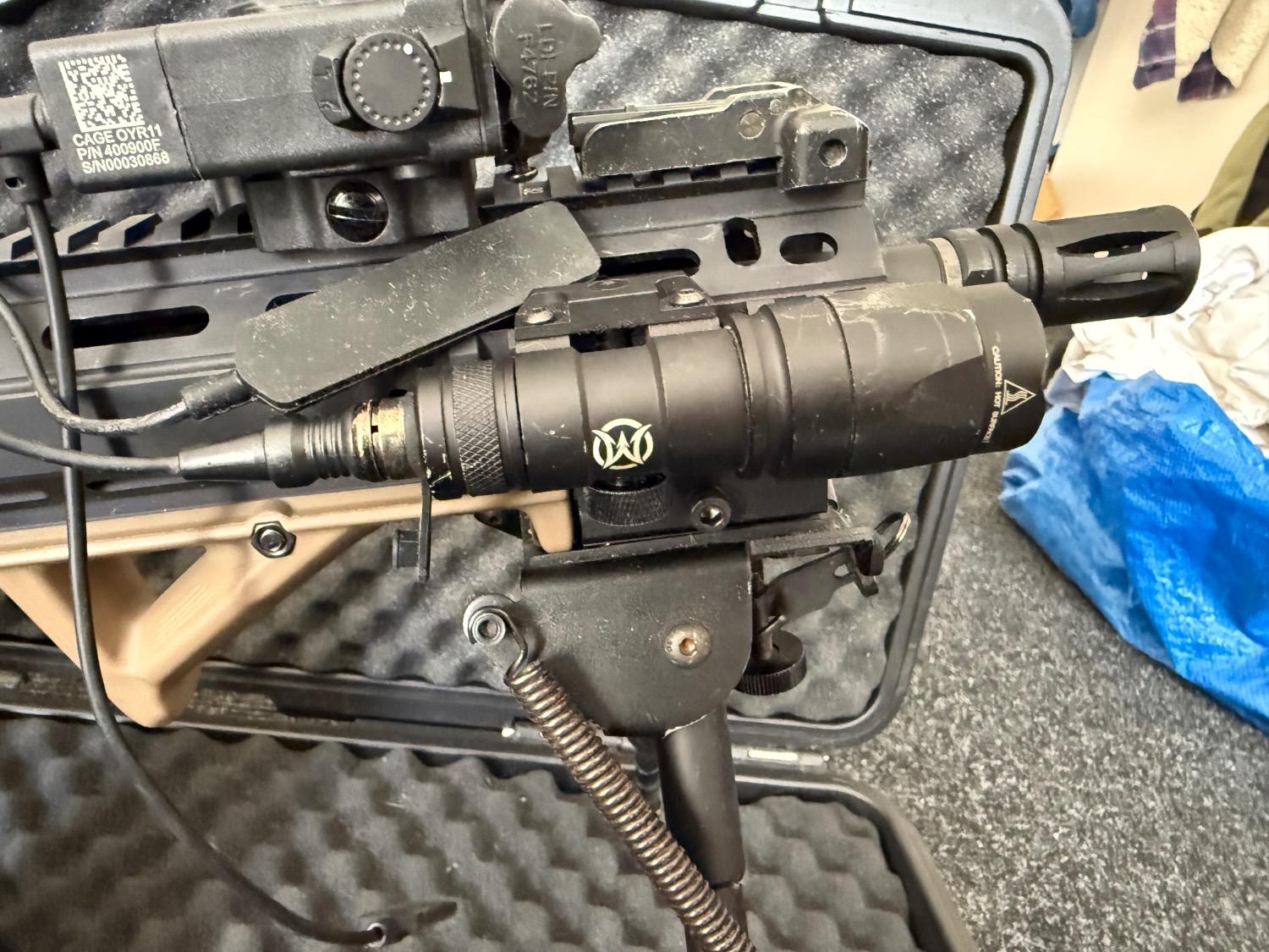 L119a2 Rail, Torch, PEQ Torch, 2x batteries, Magazine, Magpul style stock, angled foregrip, Harris style Bipod