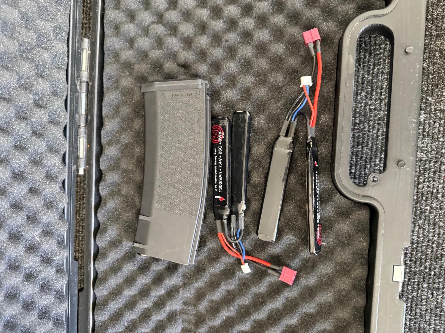 Includes Mid-cap Magazine, Surefire style torch, Flip to side magazine, Angled Grip, Harris style Bi-pod, Two 1300mAh 7.4V 25c batteries that go in Magpul style stock, PEQ box torch (accidentally bought the torch, not the laser version), all in a foam-lined case.