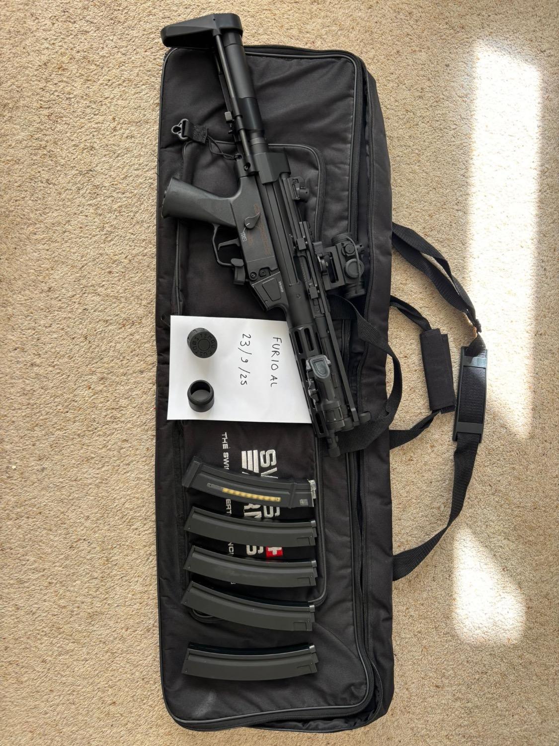 Red dot, replica surefire, mags, gunbag, stock extension tubes.