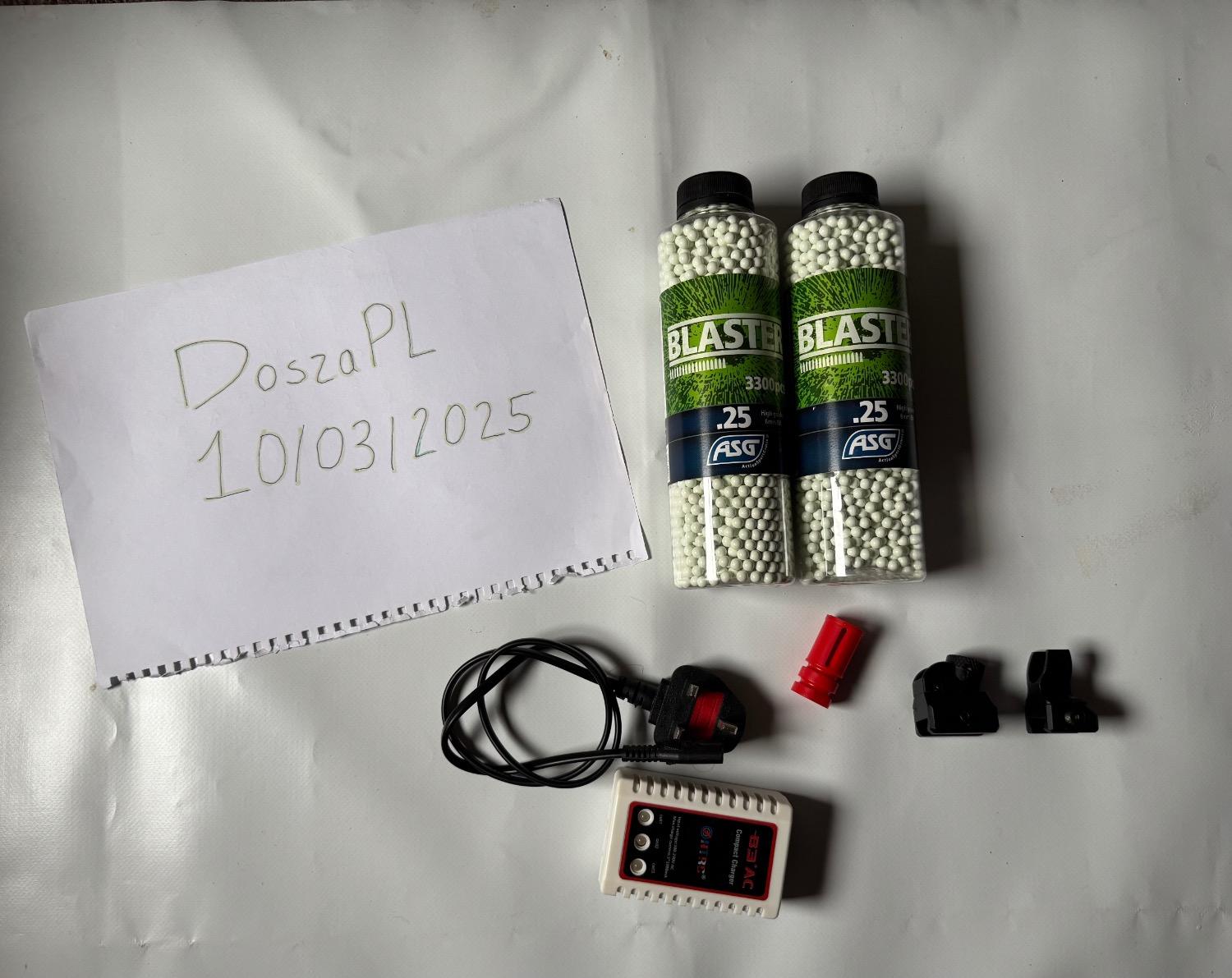 - Includes the charger, 2 containers of BBs, red dot AGOG scope and original iron sights (does not include battery as it is faulty due to no usage)