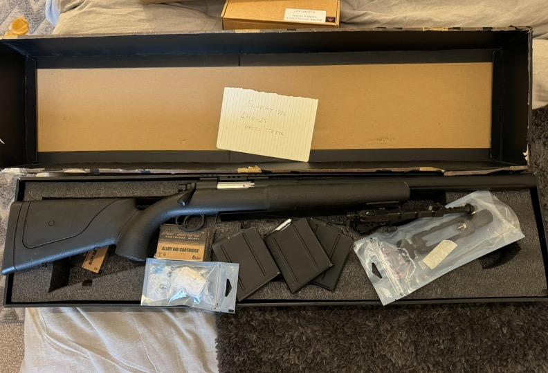 vgc overall, comes with 3 mags, bipod,co2 shell adaptor (co2 charger required) 2 packs of shells, 1 pack are low power and one are high power, i believe the high power ones leak, however i have a seal kit that will come with the rifle.
