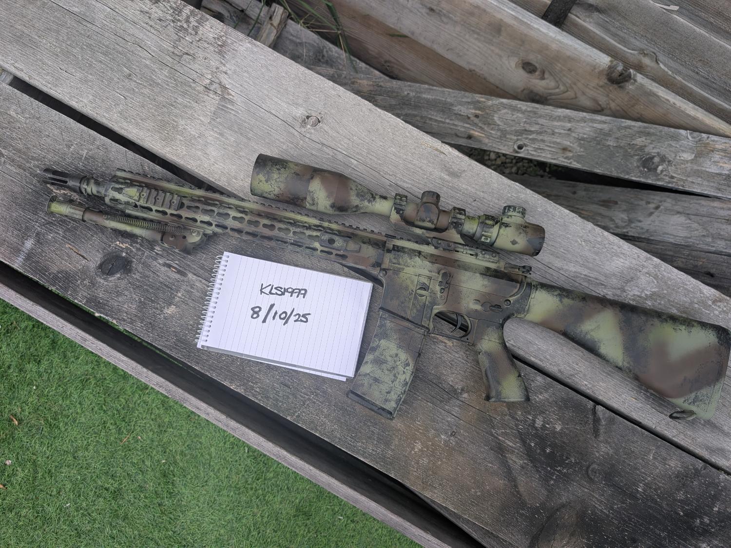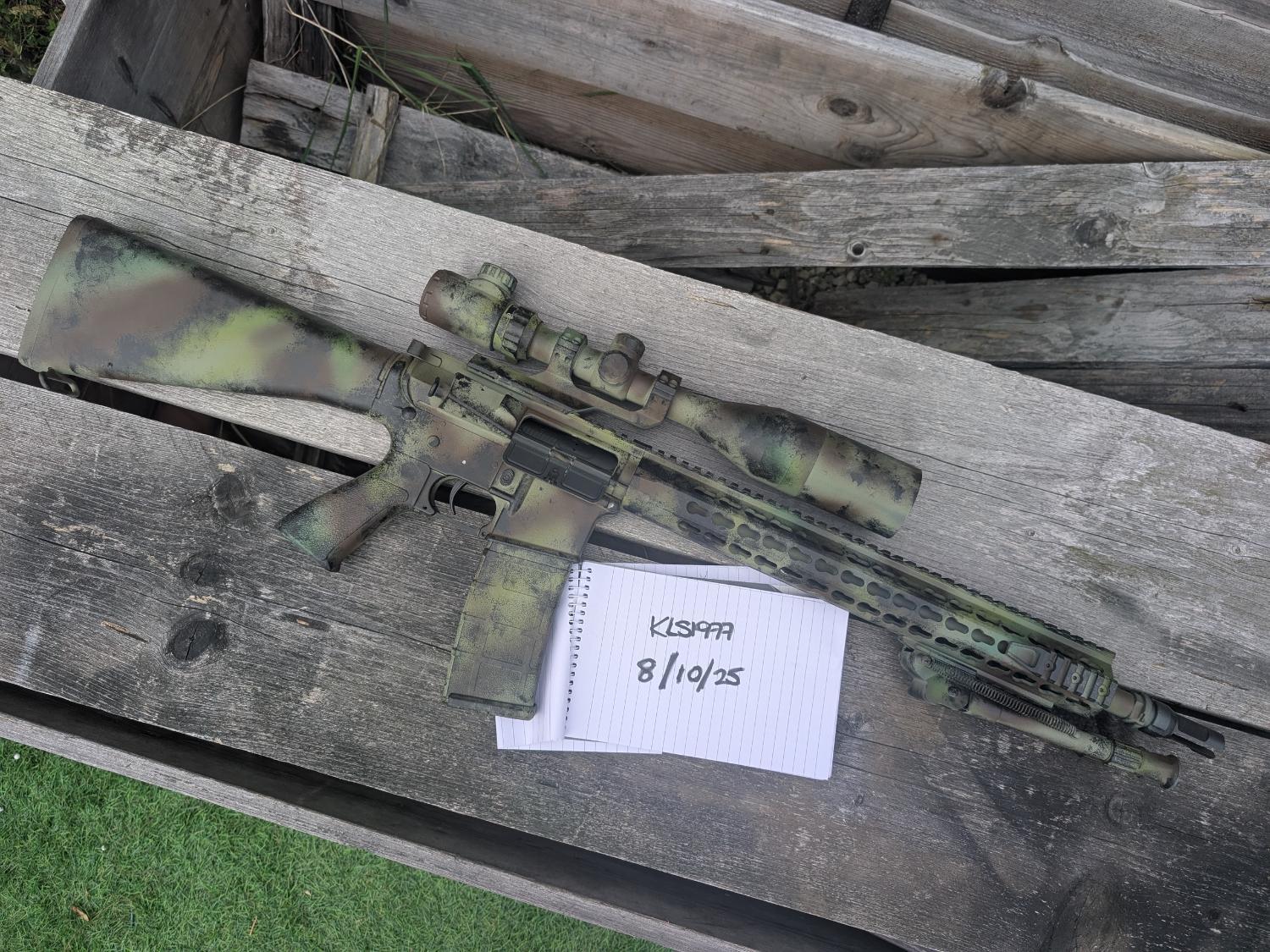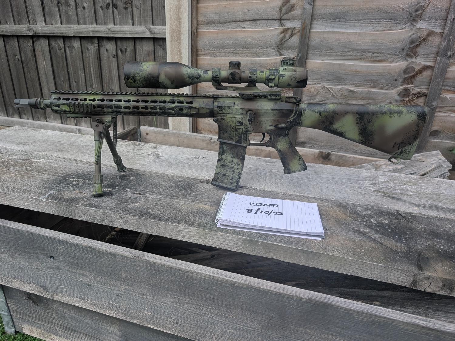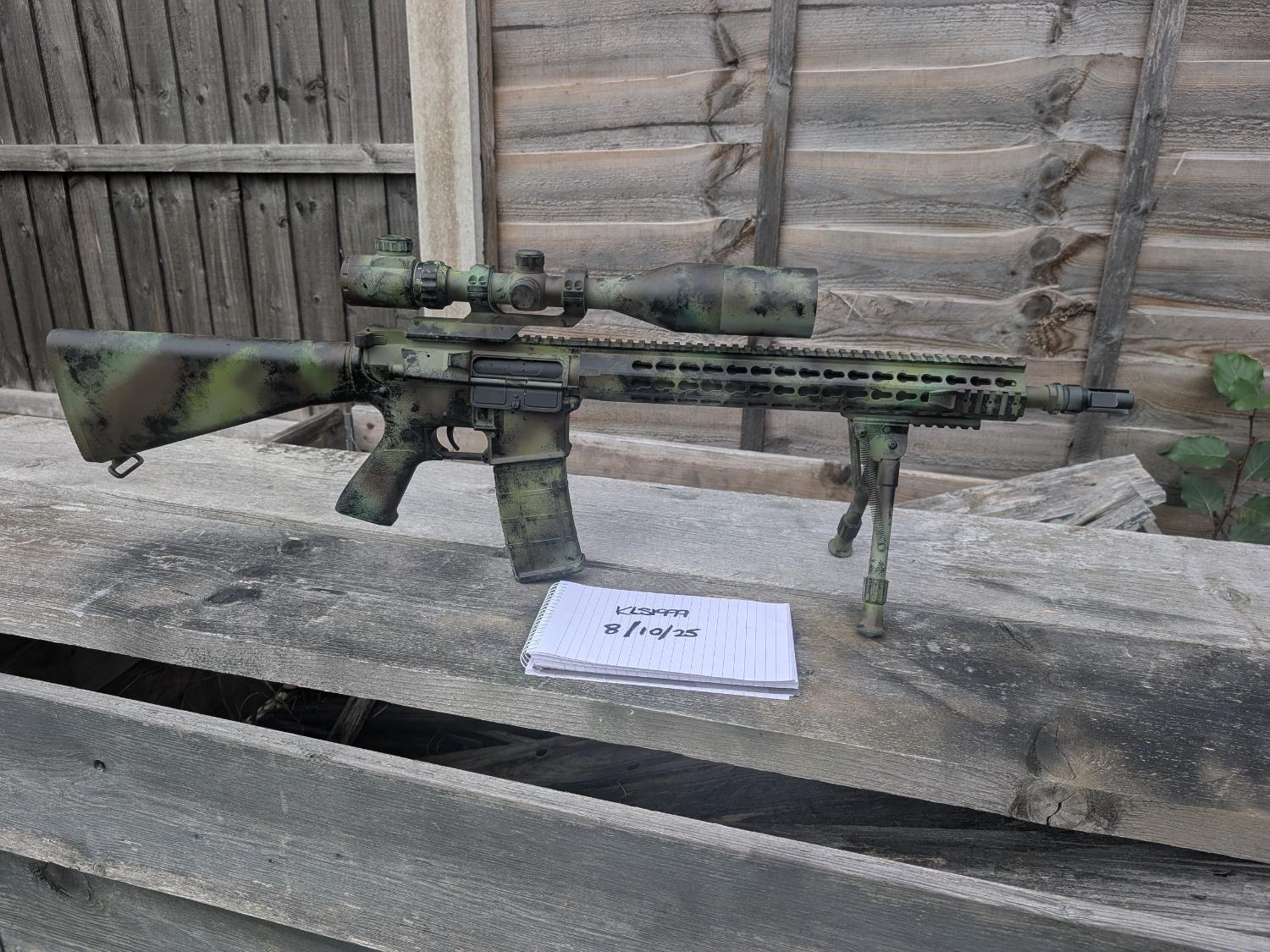 Comes as see with pics set up for spr style rifle sprayed in woodland style camo .