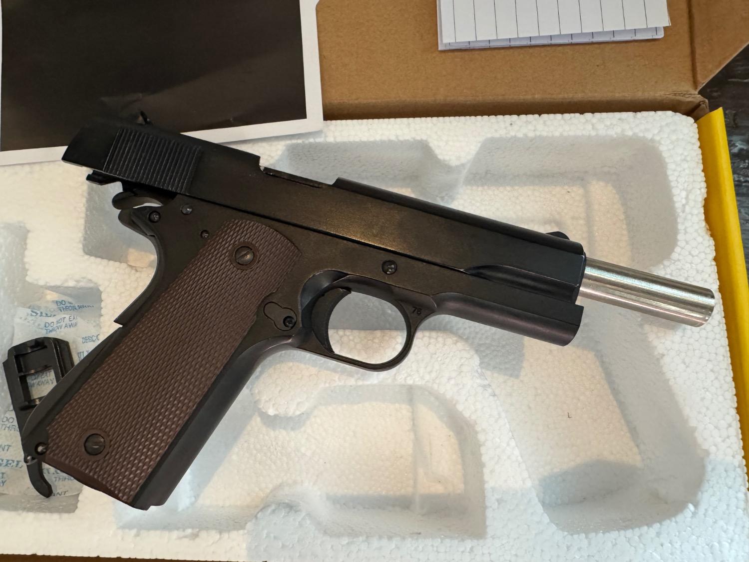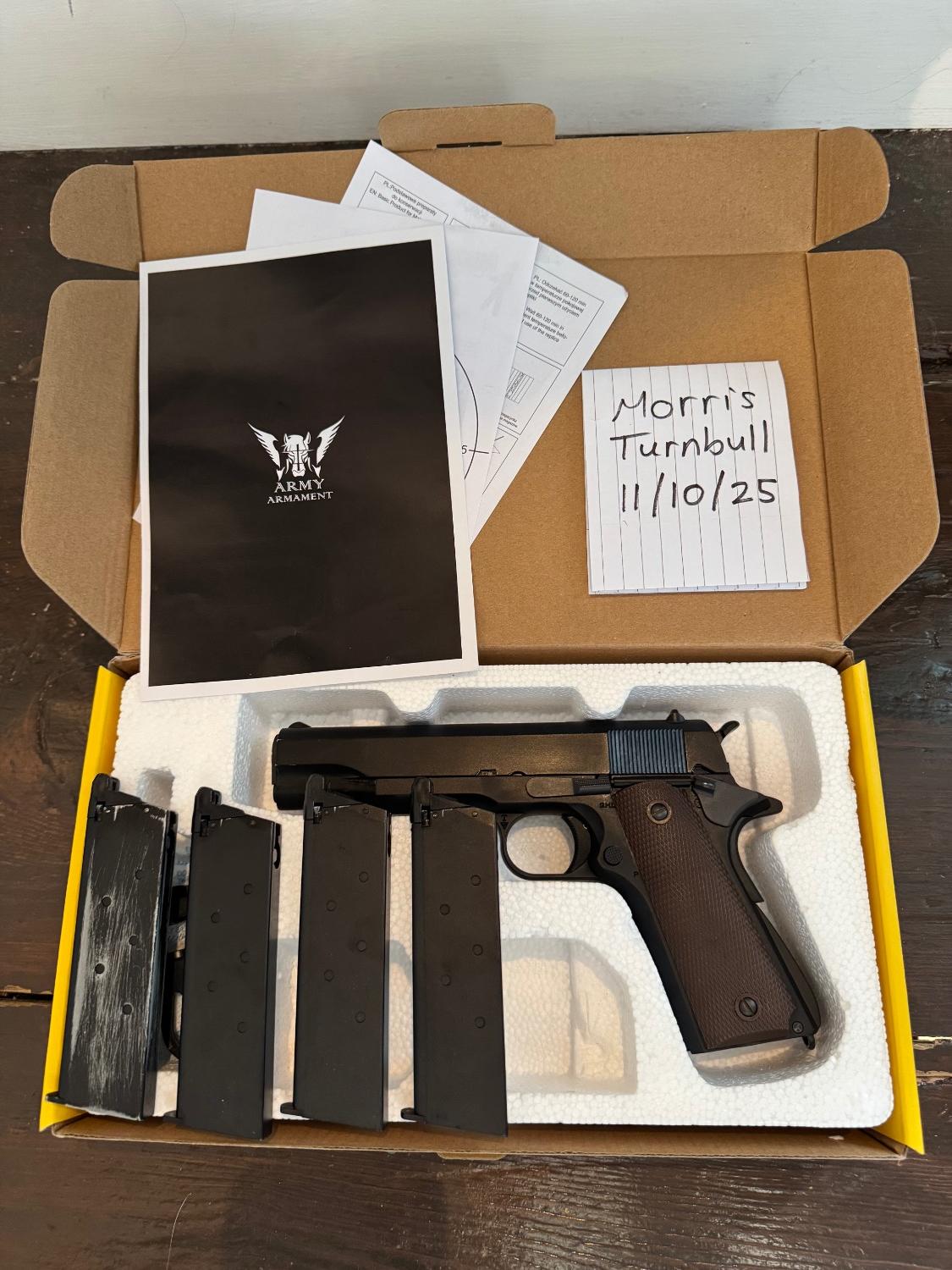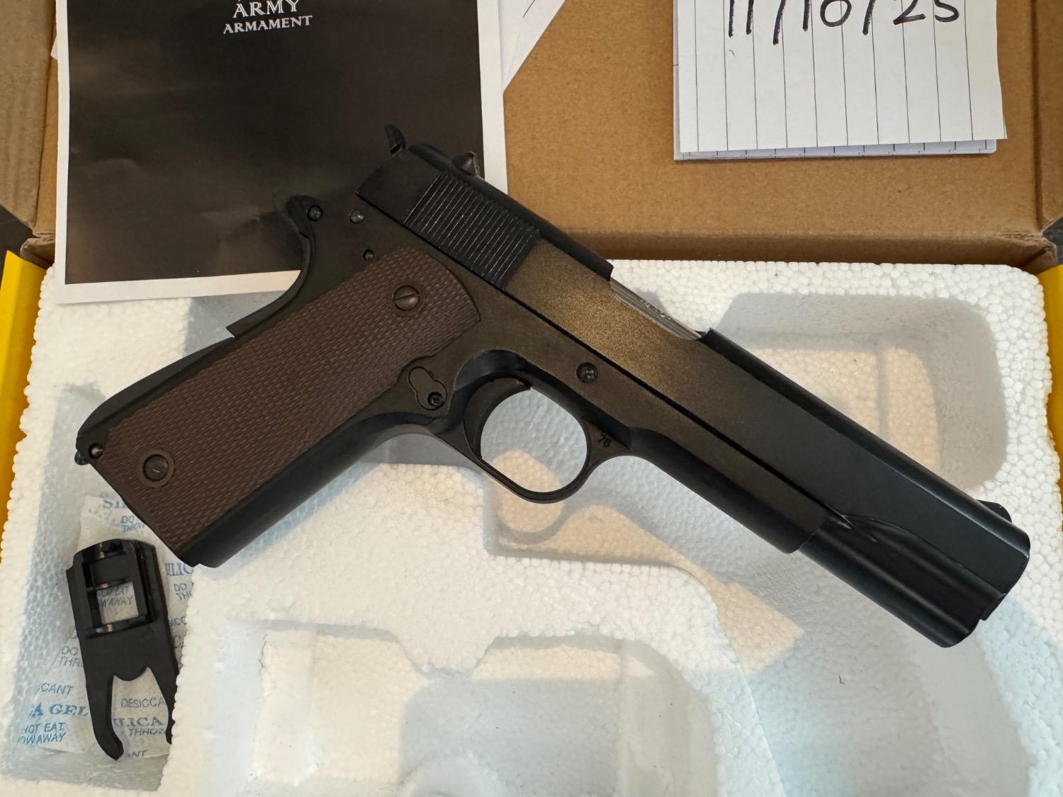 My Army armament r-31 1911 which I bought a couple months ago and just haven’t had the time to use it. It got taken to one game and used for plinking every now and then. I’d say around 350 rounds through it from new. It’s been looked after well and worked flawlessly for me when I did use it, it just doesn’t get used enough. comes with 4 25rnd leak free mags that also work perfectly. One has been sanded slightly for aesthetic purposes