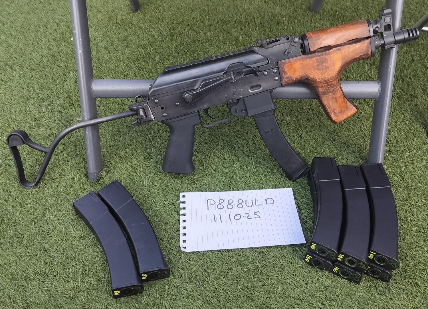 Contents gun, 3x 50 round mid caps work fine but the 6x 100 round mi caps don't sit in correctly for some reason, I think abit of filing would fix the issue.