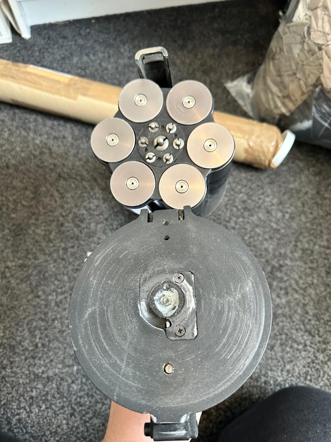 Its cranked by a hefty winding mechanism in which the barrels are rotated awkwardly by hand counter-clockwise (you will not be spinning this like a cowboy revolver cylinder, trust me). the further you wind the more tension the spring is put under and the quicker it rotates to the next chamber when fired.