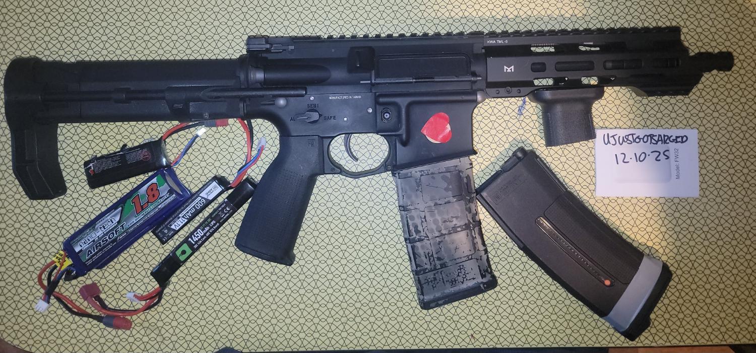 Comes with forgrip, 3 7.4v lipos and 1 11.1v lipo. Battery stock extender. 1 mid caps pmag and 1 epm1 mag.