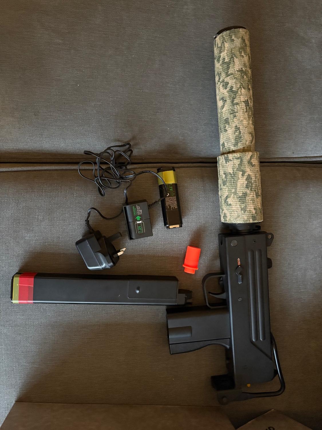 Hi, for sale or swaps. Here I have my JG Works Mac10. Had this cool little thing about 2years, only used for one game & realised it wasn’t for me! So it’s near brand new. Silencer has been wrapped in camo wrap- easily removed. Comes with 1 hi cap mag (with .28 bbs in) original 7.4 micro battery. Charger, original silencer.