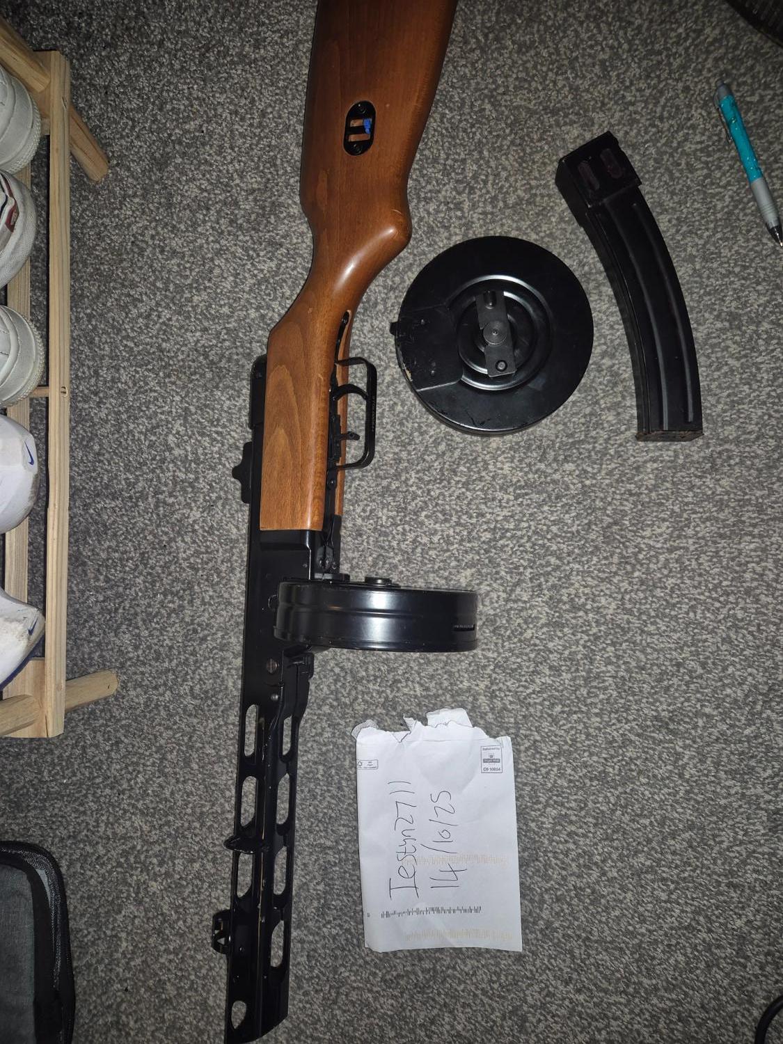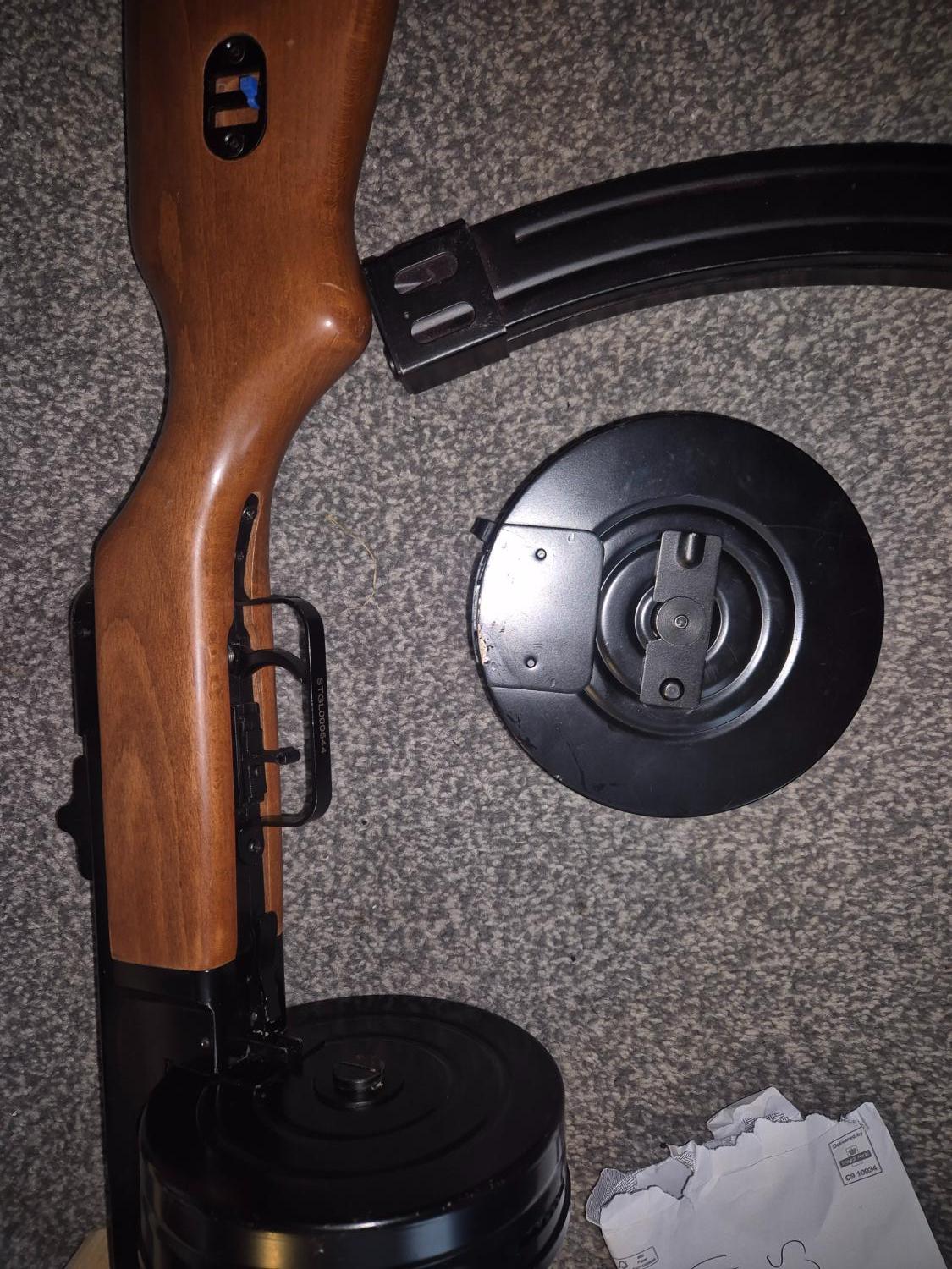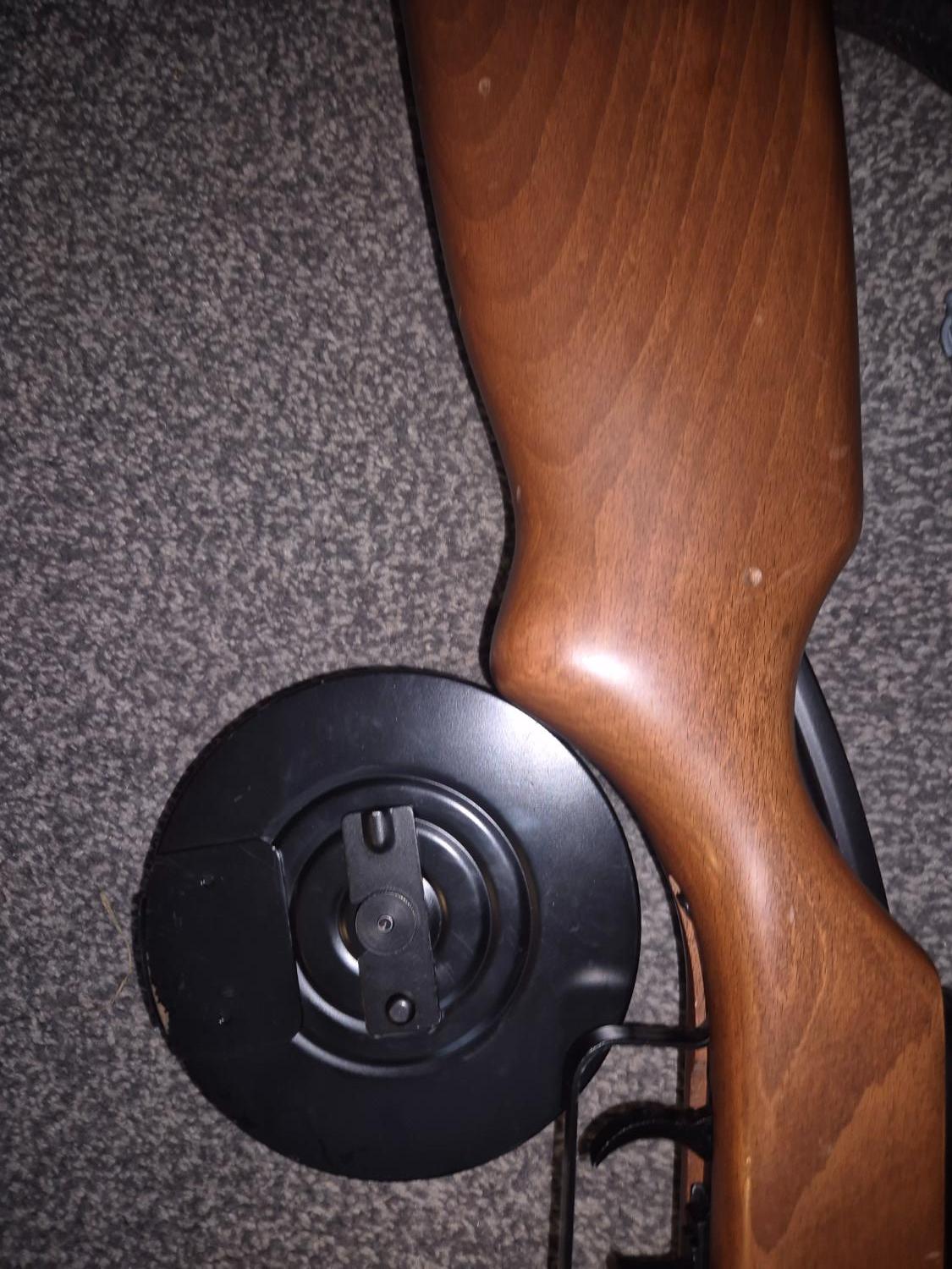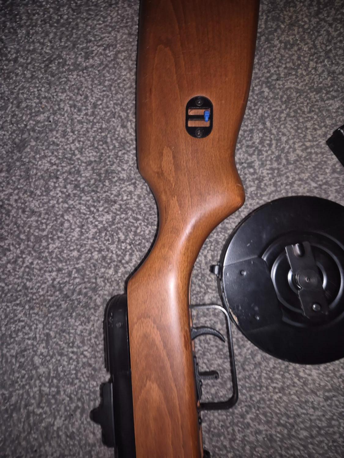This is a used gun and been played about 8 times. I can't remember what brand it is as this was a gift when I first started playing Airsoft. It's full metal with wood stock. Come with 2 drum mags , 1 needs a little looking at. And 1 stick mag. Amazing gun for you ww2 fans. Also I'm a nuprol bag.