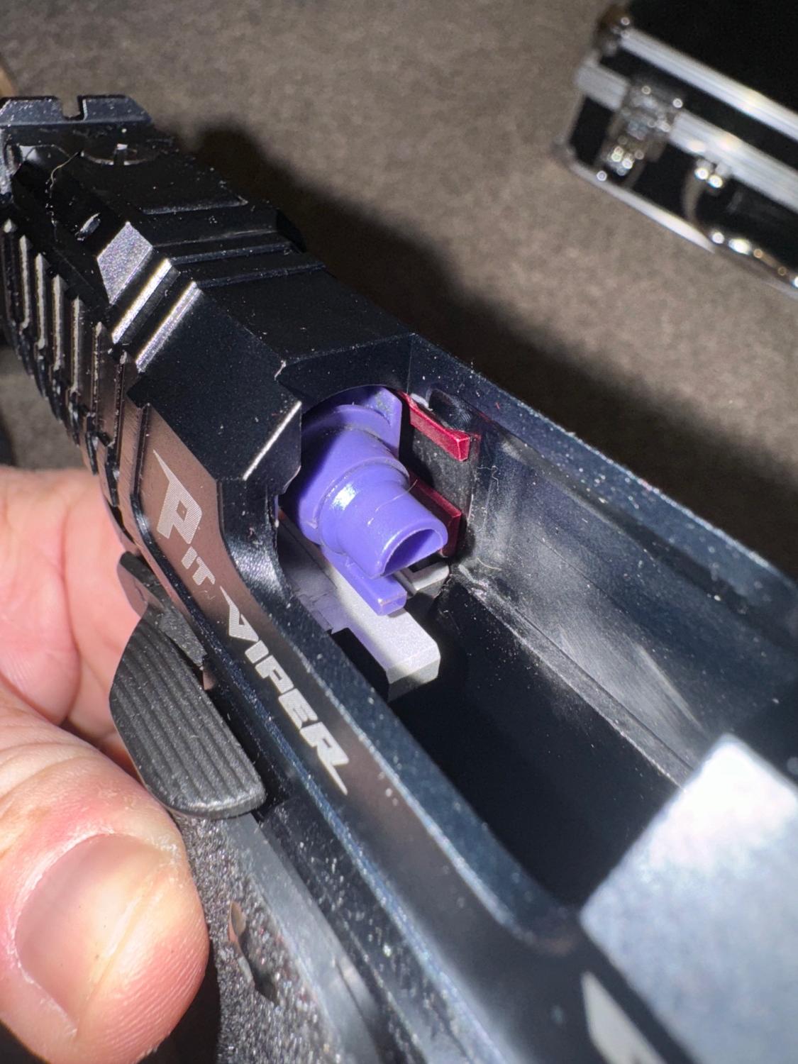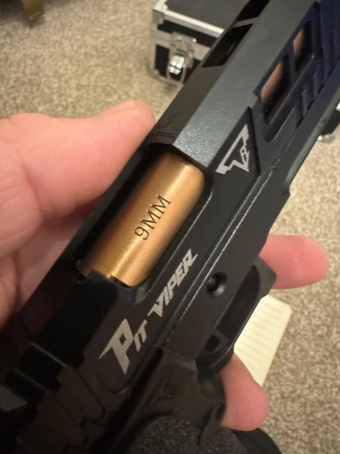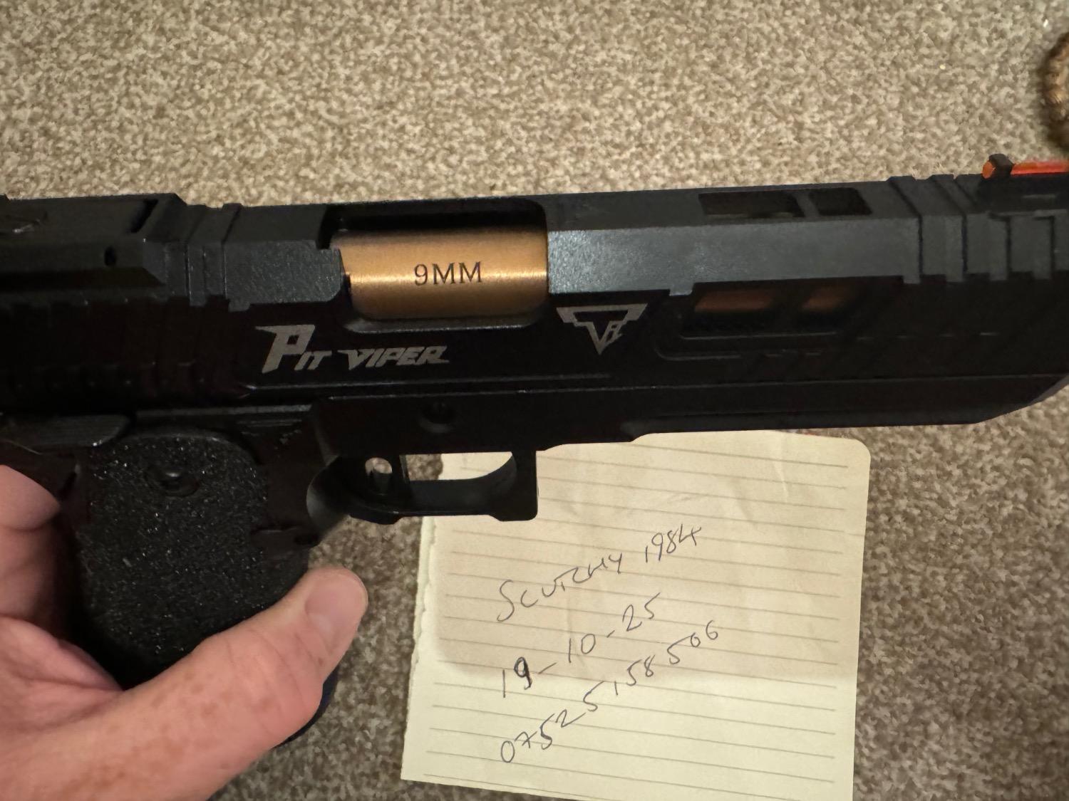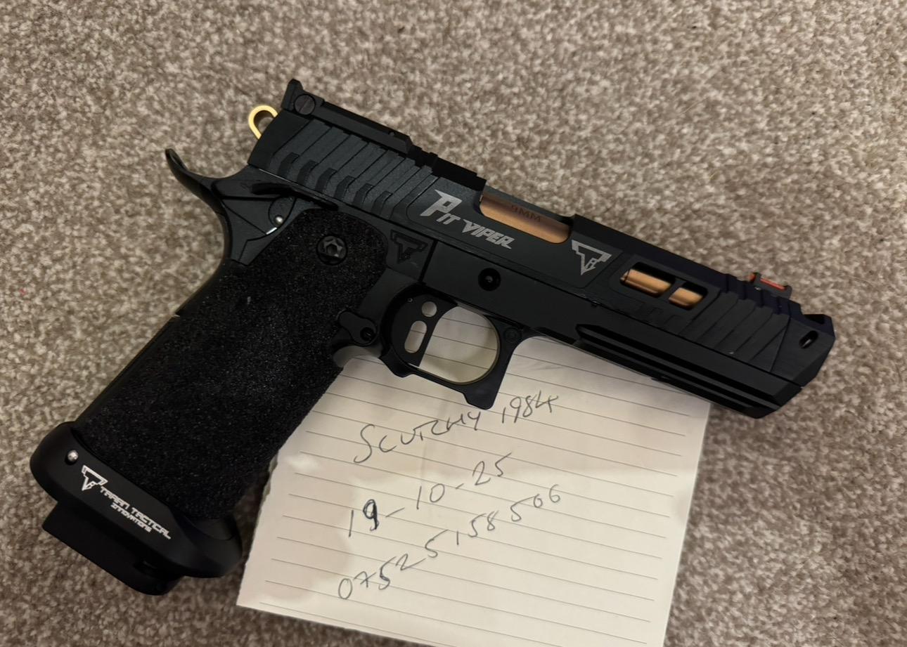 This is my 5ku tti pit viper that I built about a year ago, the kit is lightweight aluminium, and I have added a kf airsoft hop unit with 6.01 inner barrel, aip gold hammer, aip hammer and recoil spring, aip trigger, airsoft masterpiece non humped grip safety, and slide catch lightweight bbu and upgraded (not sure on brand) nozzle.