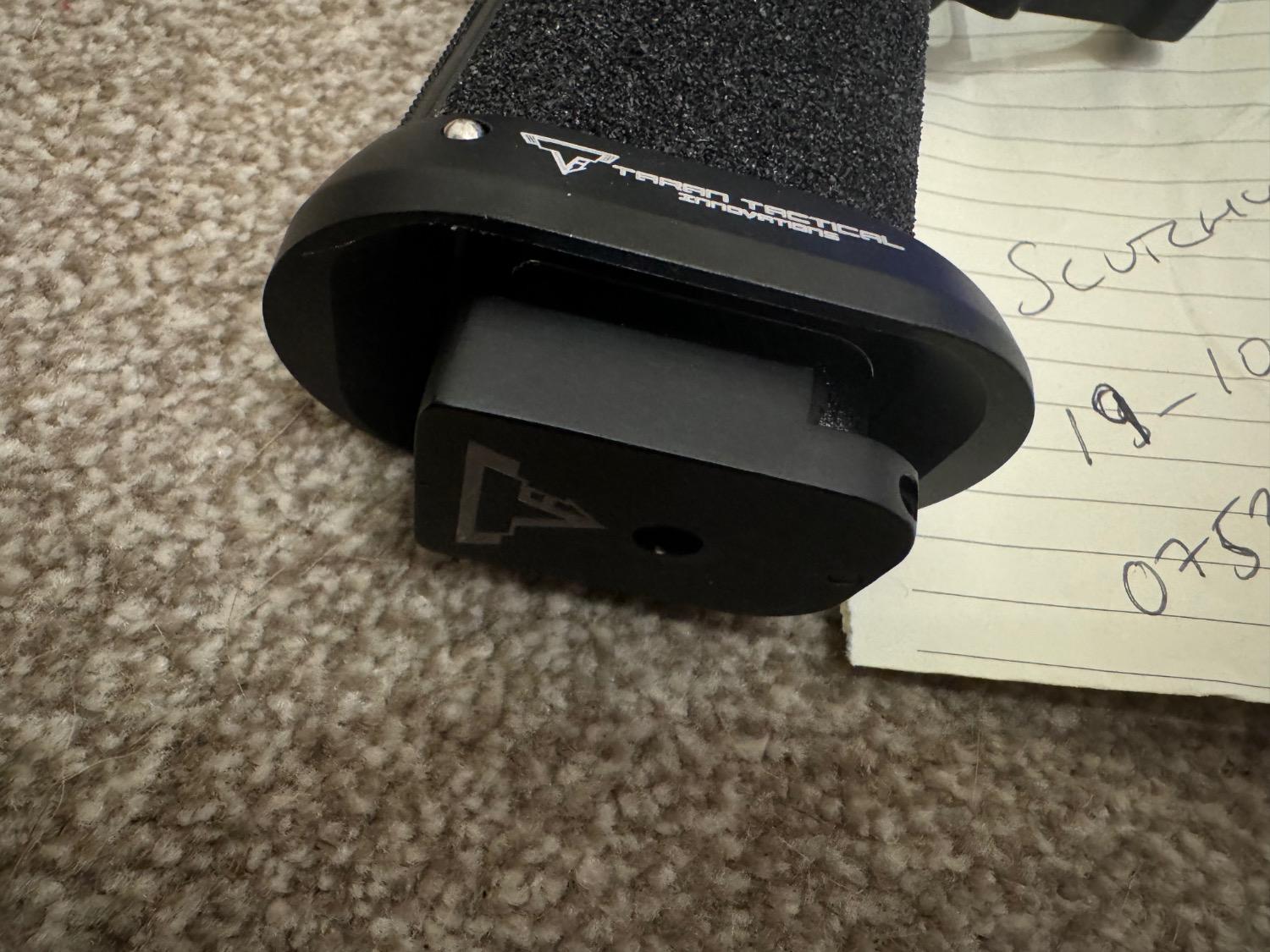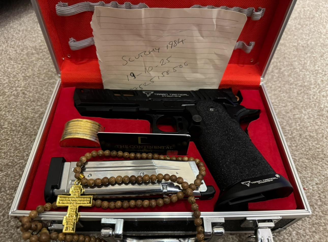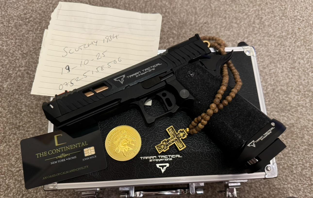also fitted is a grip tape wrapped grip, extended mag catch and tti baseplate and magwell. Includes a chrome tm mag, and finished off in this alloy framed case with foam cut to fit the gun, mag, a set of John wick coins, id card and necklace.