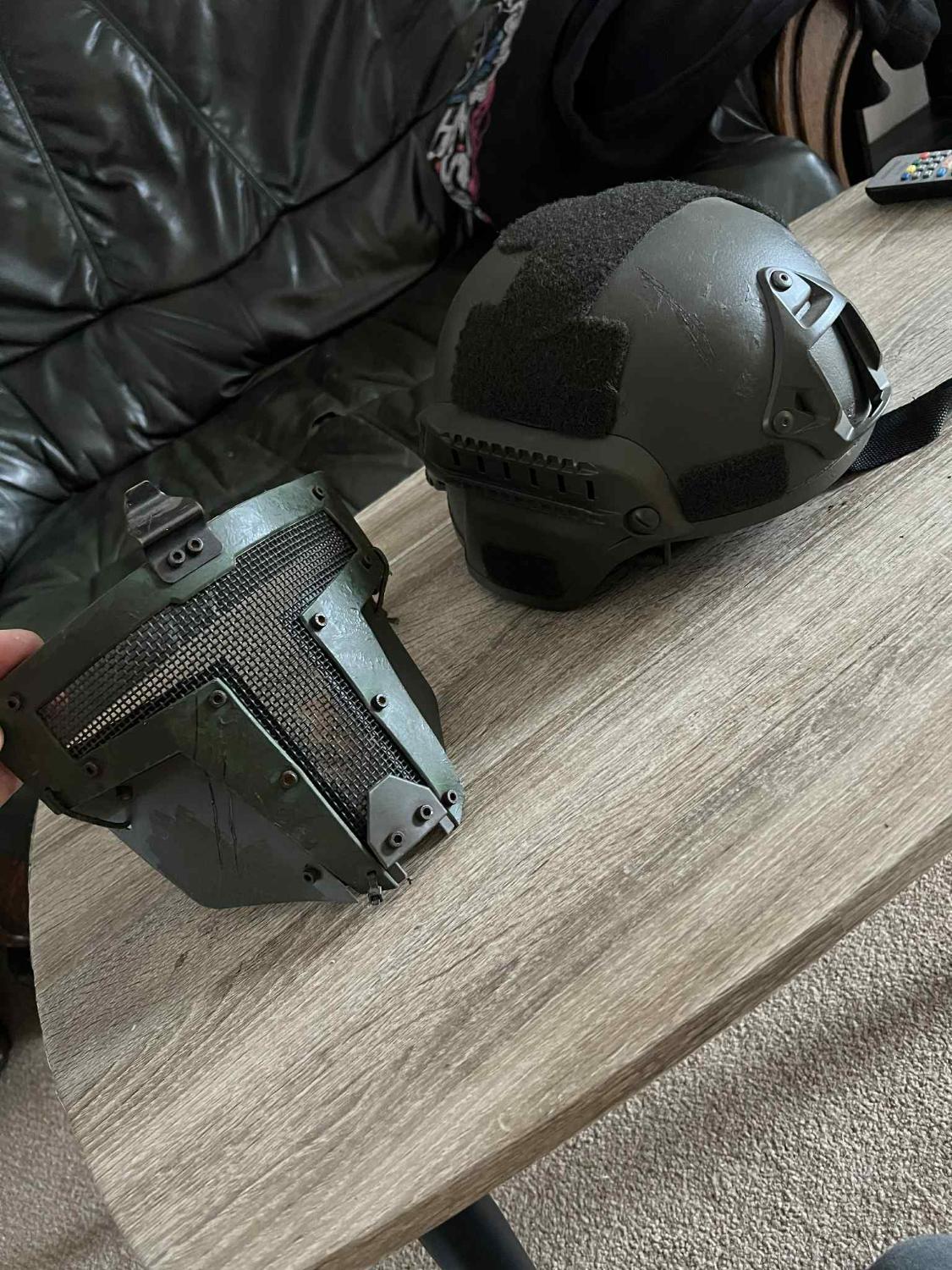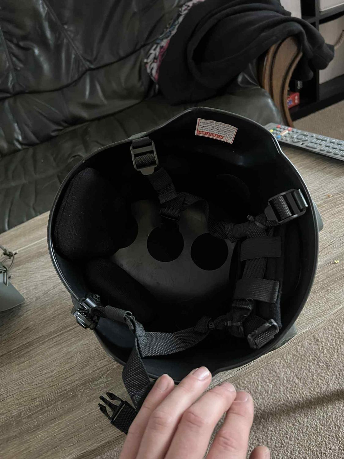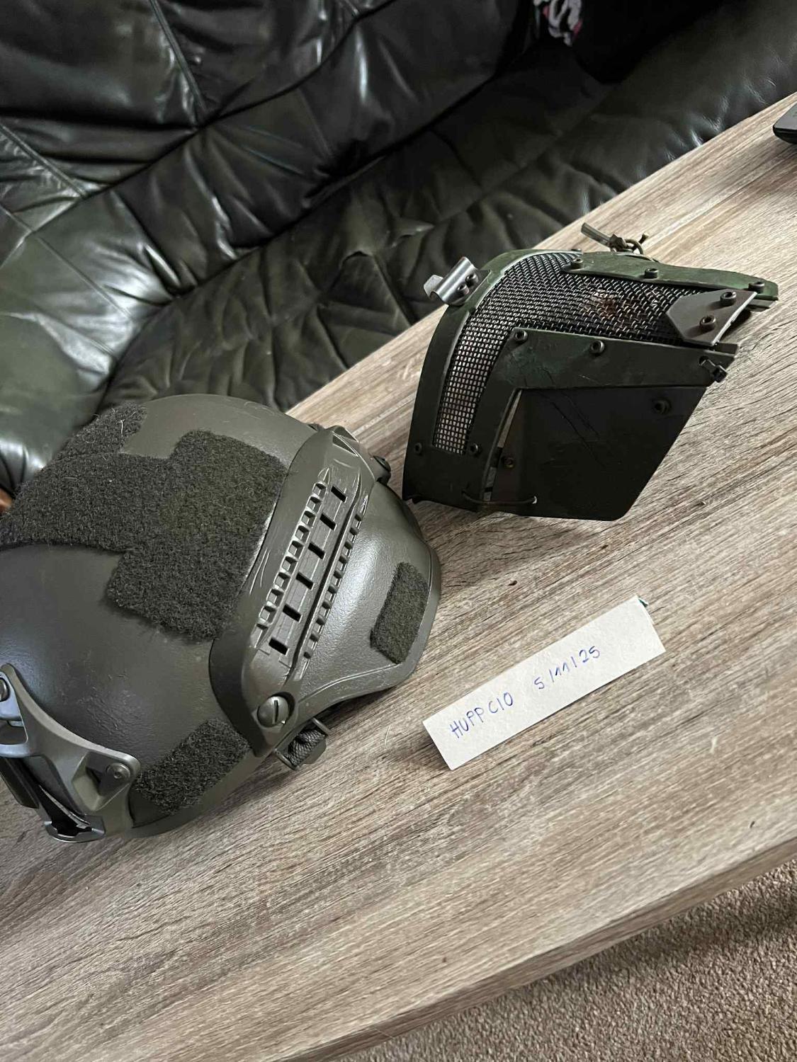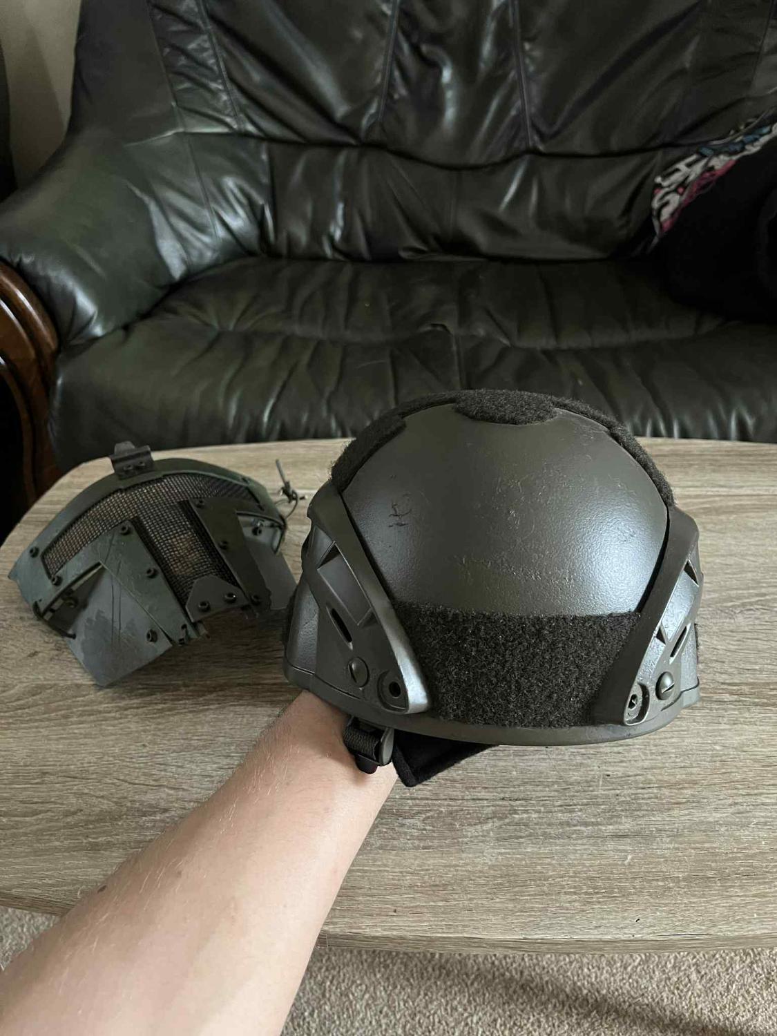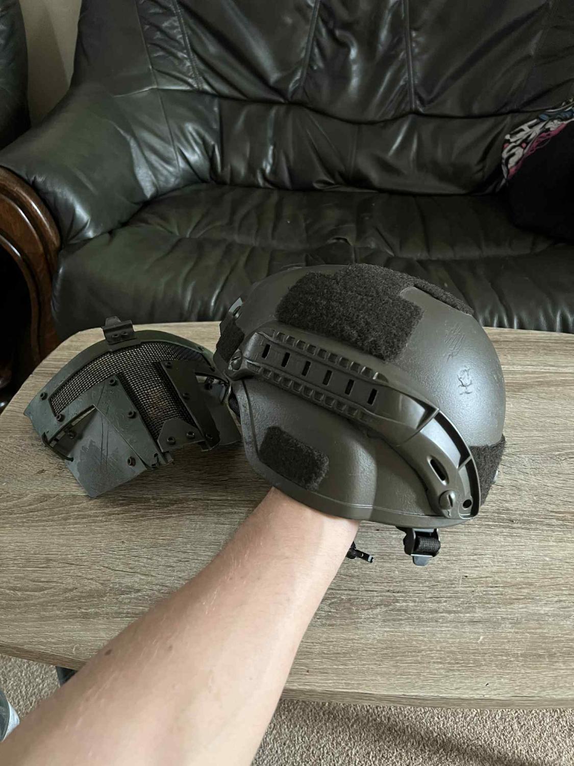 Helmet is light, made from abs. Painted with nato green and some battle damage added so it looks cool.