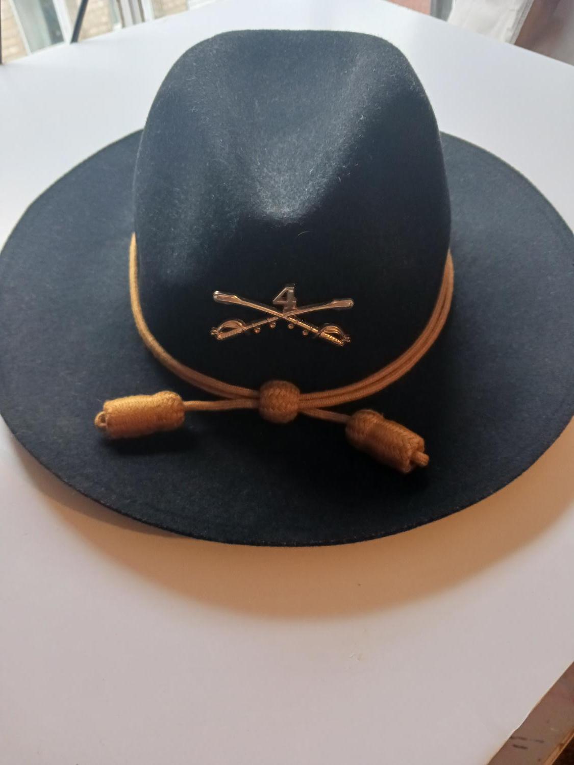 The uniform would be worn by a cavalry trooper during the 1800s indian wars (post US civil war) The hat insignia is depicting the 4th cavalry however the uniform has been left un-altered so any rank up to officer may be applied with little uniform changes.