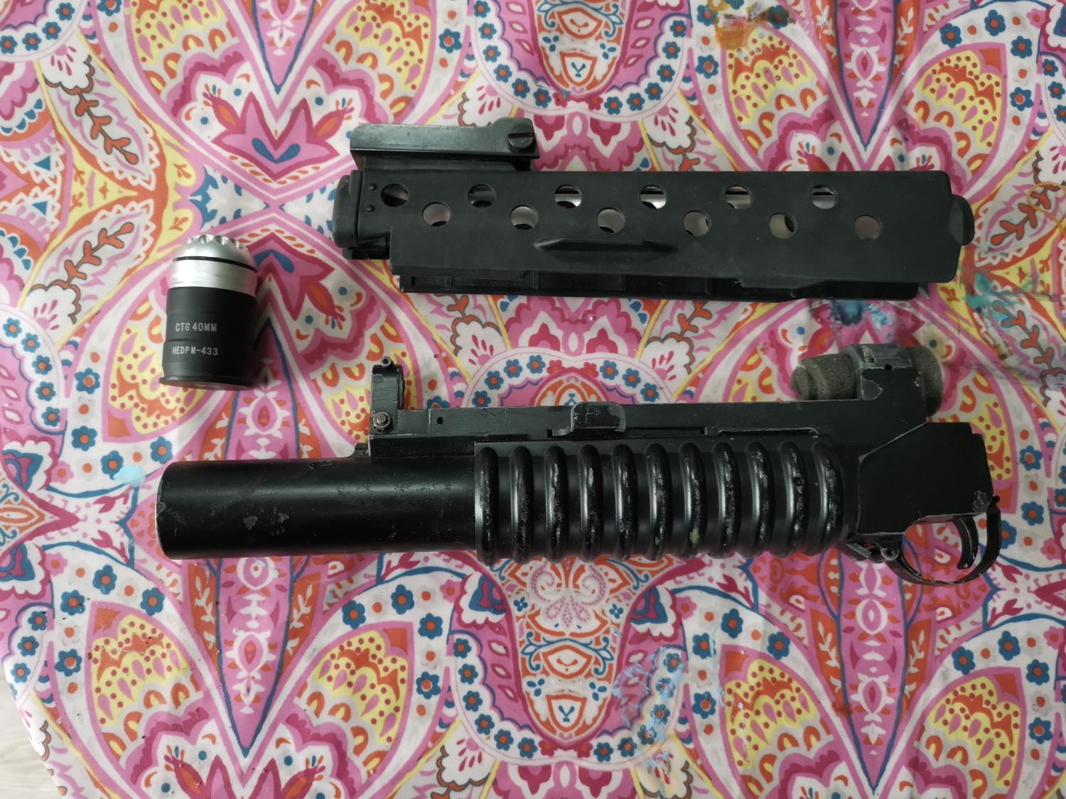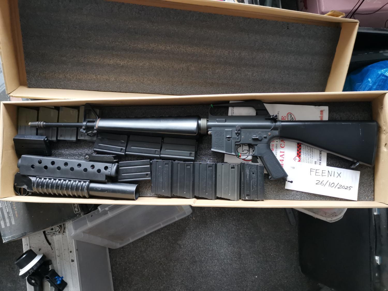 Multiple VN mid cap and high cap magazines, The M203 Grenade Launcher, The heatshield for attaching the M203 to the rifle, A Grenade for the Launcher, Original box, Original Manual