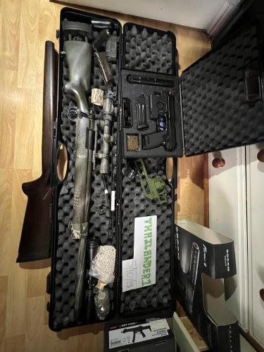 CASH AND COLLECTION ONLY, LOCATION: NORTHAMPTONSHIRE, NEAR KETTERING. reason for sale is I only play CQB now. SSG24 with case w/ 2 scopes, 2 mags + 1 broken mag (for parts) (you can still purchase spare mags online) Bag of some 0.40s Wooden Stock (Damage in areas as pictures show) Speed Loader adaptors for the mags Various other bits that are shown in the picture. The Nov bbs are actually just 0.4s filled inside READ: you need to press your finger on the base of the mag when in the gun when putting the bolt back into position, I’m missing a stock screw that can still be purchased from novritsch’s store and I’ve heard the gen 2 mags are better. Other than that the gun shoots very well, good quality sniper TM MK23 everything standard with what you'd get new, so gun, unit, suppressor, mag, case also with the DTD holster + belt clip attachment to it Nothing of note for this one, barely used, mag is leak free, great condition. Cheers, PM if interested, I’ll drop mobile number after450.00 GBP