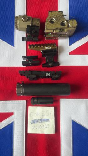 Most parts are evolution gear but some are unknown angry gun surefire sf556 suppressor and flash hider £75 Royal Marines contract railscales monolift riser replica £30 evolution gear reptilia acro p2 riser 1.93 £30 unknown brand 1/3 reptilia acro p2 mount £10 Unknown brand Unity tactical tan riser £20 Evolution gear unity tactical aimpoint magnifier riser mount £25 Unknown brand eotech magnifier and exps (potentially holy warrior) £55Ask for price