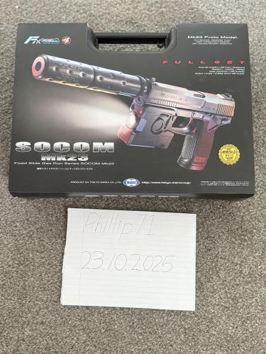 This has been upgraded with the following :- Stalker TDC and Prowler Plate. SR Hop Bucking 60 Degree and paired with Laylax Nine Ball Power Up SOCOMMk23 133 mm inner barrel. Also comes with a extra ASG Mk23 Mag ,Sniper Mechanix Small Hex Suppressor with a 16mm - 14mm to adapter. Will also come with all the original parts. Also a almost brand new bag of BLS .45 gram BB for above. Does not come with the LAM Unit. Used in one game,annd in still new condition and not for me .Both mags are gas tight. Can be posted at buyers expense .165.00 GBP