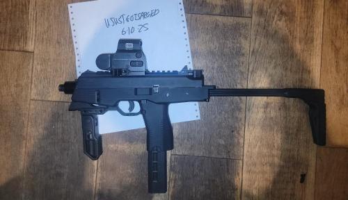 Mp9 gbb, fully working. Just serviced it, fully working, mag is gas tight. Holo has been shot but still works, just a few extra reticle. Has 14mmccw outer barrel and orginal outer barrel included. Originally 2 tone, most of the blue is off £140 all in posted