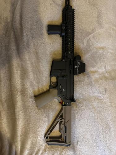 Built off a G&G SR25 ETU w Dave Customs L129a1 sharpshooter rail. Prometheus inner barrel, hop, piston & chamber and uprated gears. 11.1v lipo ready, 2 magazines, 1 mid cap 1 high cap. last chrono'd at 322 fps on .36g bbs A lot of money has gone into this build and i'm really reluctant to part with but juggling a newborn baby and several other projects. Would MAYBE consider swaps for a SIlverback TAC41-A or an APFG MCX (Tan only). Cash collection from stevenage or can post for a small fee.650.00 GBP