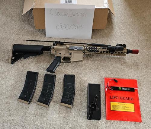 Selling my twice used first airsoft gun. Works absolutely fine, reason for selling is i only have CQB places near me and immediately wanted something smaller. Comes with lip battery shipped in safety pouch. M4 mags x 3, M4 Speed loaded, Flashlight with pressure switch. Any questions welcome, and can ship if need be.160.00 GBP