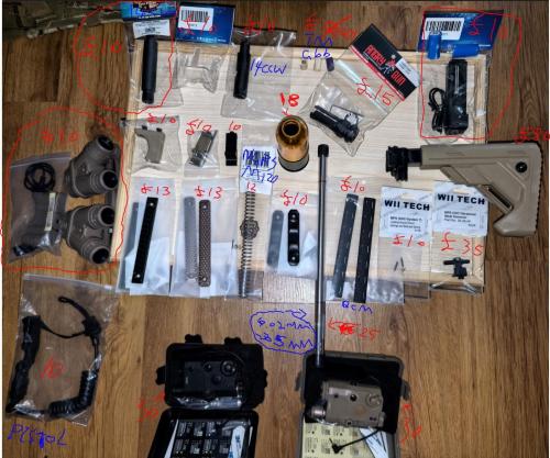 Giesselle mk4 9.5" rail. Been used . Has. Some marks but good condition . Has all bolts and fittings £40 Vfc fully adjustable bi pod . Hard to get hold off . Robust bipod £35 Kytac stock. £25 Ctr style stock £13 14" heavy m4 barrel with birdcage style flashhider ( dmr) £27 Canted front and rear sights £12 ASG by tracer . £209,999.00 GBP