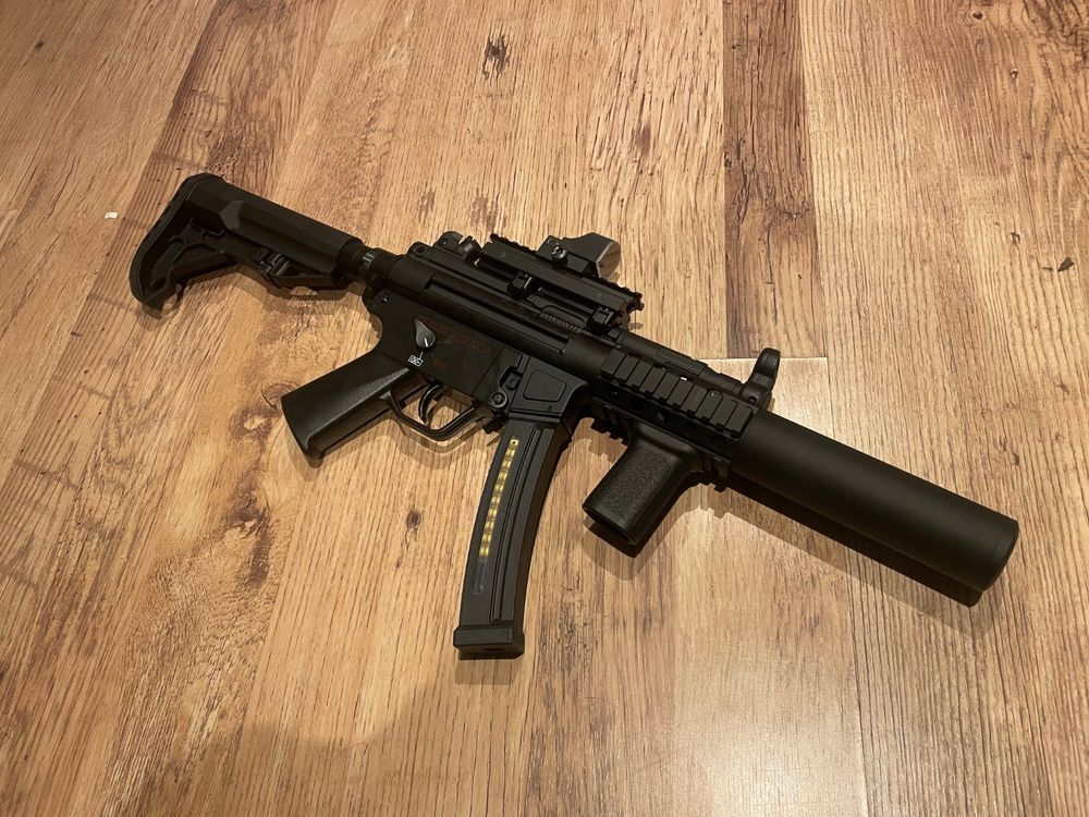 Latest little build/wanker gun/ dsg complete. Jg mp5k Cyma mp5k m4 stock adapter deepfire mp5ksd handguard/suppressor with 18:1 shs gears, and shs dsg. Zci cylinder, full steel rack piston, pom piston head, air lab sorbo pad to correct aoe, warhead motor. perun v3 hybrid mosfet. 200mm Zci tbb maple leaf bucking. this thing puts a big old smile on my face ??????1 point -