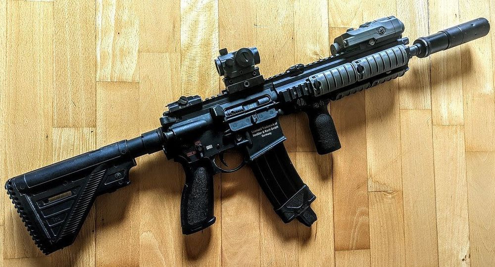 Tis the final (hopefully) form of my carbine. Swapped the 6.5" handguard for a 5" ARP one. Had to turn down the TTI outer barrel because the G&G barrel nut is very narrow and didn't fit (you can see the bare aluminium "rings" where I removed material off the barrel). Also removed the EVO sights as they are too low to be comfortably used with a lower face mask. All I need now is a decent sling and maybe a tracer unit.1 point -