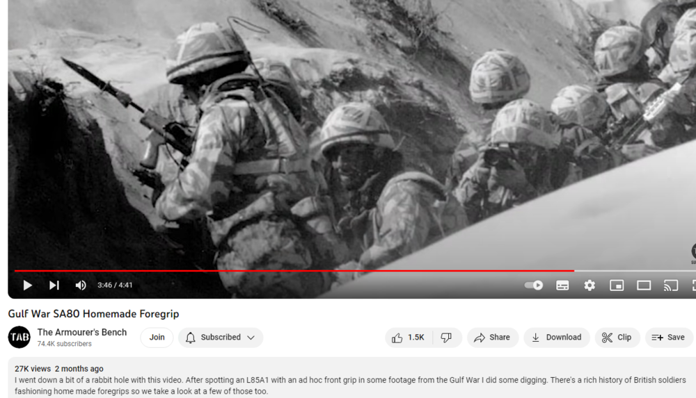 I man-handled his pew-pew (yub-yub etc) The grip (and perhaps also the weight of the Elcan) do a good job of neutralising the normal rearward weight bias of the L85, so it's ergonomic, even if the looks are, as Dan says, a bit... off? Somewhat 'inappropriate' foregrips are nothing new though, apparently...1 point -
