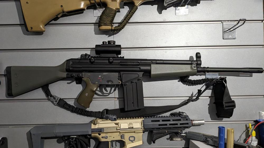 Impulse purchase ahoy. Thanks very much Paul @ Action Hobbies for tempting me into yet another toy I don't need! JG G3, set up as DMR, so semi-auto only. I was worried when I found it was all-plastic, but those fears were unfounded tbh, it is very solidly put together. The motor turns over reasonably nicely on the stick 7.4v LiPo that fits easily in the foregrip. It was upgraded at Combat South apparently, and they rewired to Deans already, which saves me some ham-fisted soldering A few test shots down the garden proved it shoots nicely. Chrono'd at 320fps with 0.28g BBs so it's not exactly breathing fire. I guess I won't know how good it'll work on the field for a while now, but I'll be tempted to stick in a weaker spring so I can get rid of the DMR's MED and just play it as a normal gat. The little RIS rail .... hmmm, how am I supposed to fit a scope on there? I guess I need some sort of cantilever mount? I like the HK iron sights, so maybe it'll stay as it is. It feels damned cool though!1 point -
