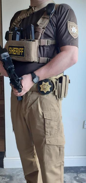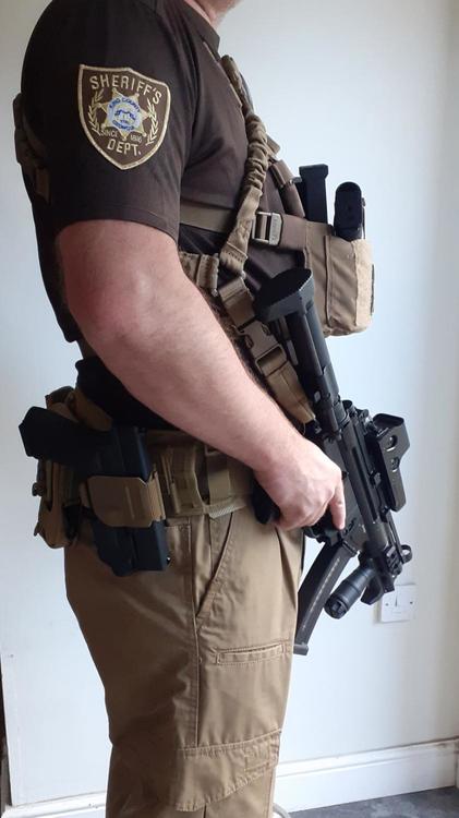 My County Sheriff LEO loadout, just unsure whether to swap the chest panel for a VX plate carrier and awaiting a full length MP5A4 to arrrive. Carrying a Glock 17 with GTL10 on belt with 2x extra mags and the chest panel has 4x MP5 midcaps with a Glock 27 and 2x extra mags. Just need to swap the plain brown cap for a King County sheriff one and should be done.1 point