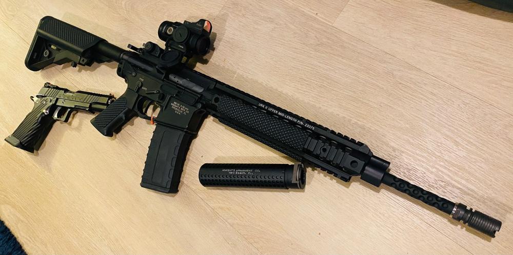 I made the mistake of looking at some of these falling down an internet rabbit hole and ended up hanging my nose over the gun in the title. Of course I then bought one and following are my thoughts on the gun. In case you don't know what it looks like... https://images.app.goo.gl/9mtVnfitABNswYUX6 For me it's a sexy gun, maybe the sexiest. Sexy and heavy. It weighs 3.6kg with mag, battery and sight and more than a little front heavy. It's the Blue version, so inside it should have half decent bits and clearly the air seal is ok, firing at 365 fps on a .2g BB, through its little 220mm barrel. It's happy on a 3S lipo or a 3S life. I swore to myself I would use it before taking it apart, but I didn't. It had a very clunky fire selector which bothered me greatly so I pulled off the sliding stock, which is very nice and sturdy, with a great extending action (only 1 of the 3 extended positions is useful to me, so I will mod those later) Once the body pin was out, I slid out the gearbox out and pondered the fire selector. I am used to a G36, they are V3 gearboxes and this is a V2. I don't recall working on a V2 before so of course I ploughed ahead, pulling the motor out and sliding the plastic bits off after taking the fire selector levers off ( grubscrew on the left, then pull the shaft and right selector lever through the gearbox. There's a "plastic bit" that sits in the plastic lower, through which the selector shaft passes from the right and gets sandwiched by the right selector lever. Anyhoo, the gearbox has a quick change spring, a shiny ribbed cylinder and a plastic nozzle, sans o ring. The casting is textured for some reason, it's not radiused and not shimmed properly. I noted that the plastic fire selector plate was binding leaving safe to semi on the contacts, which stuck up really high, so the copper part of the fire selector plate had a lot of work to do to get past them. I imagine it's meant to electrically disconnect the trigger as well as mechanically lock the trigger on safe, but it doesn't do the electrical isolation. I will probably rewire this given the pointless contacts. The fire selector plate and the aforementioned "plastic bit" ( a sort of cam) work together provide a crude detent, in addition to the detent in the left fire selector lever, when selecting safe, semi and auto. For safe the plastic bit has kind of beak that goes over centre on the bottom of the fire selector plate, on semi there's a nub on the plastic bit that nestles against a raised bit on the fire selector plate and on auto, the aforementioned beak engages the raised bit. To smooth all this out required: Pushing the contacts down ( they may have been incorrectly seated) so the fire selector plate would move more freely Taper the beak of the plastic bit, so it would engage safe with less force and move from safe to semi with less force. Reduce the size of the nub on the plastic bit to engage semi from safe more smoothly. Taper the top side of the beak so it would more easily engage in the auto position. There is still a detent effect putting the fire selector plate in the right place, which now works with the fire selector levers own detect, meaning it all clicks into place now. Much like my G36s. Having, as previously mentioned, sworn to not take this thing apart I now have a list of things to do. Spring change, maybe nozzle change. Shimming and consequently adjusting motor height. Filling in the 2 useless cut outs in the sliding stock so it slides to the right position. Add a MOSFET ( nothing fancy, I have a load of 3034 chips to use) Some of the MOSFETs used in the posh ETUs are really not very good. Altho the Jefftron ones are very nice. Rewire the thing in decent cable (the PVC stuff doesn't like the bends this gun seems to require and it uses lot of it, going to the back of the gun from the gearbox then to the front to the battery) Short out those weird contacts under the selector plate and get the copper off it. That's probably enough for now, please feel free to tell me where I'm going wrong or what else I might do since I am already doing this ^^^ Maybe you've noticed there are not many pics, Some tech issues prevented them appearing here. I'll add them as soon as I can.1 point