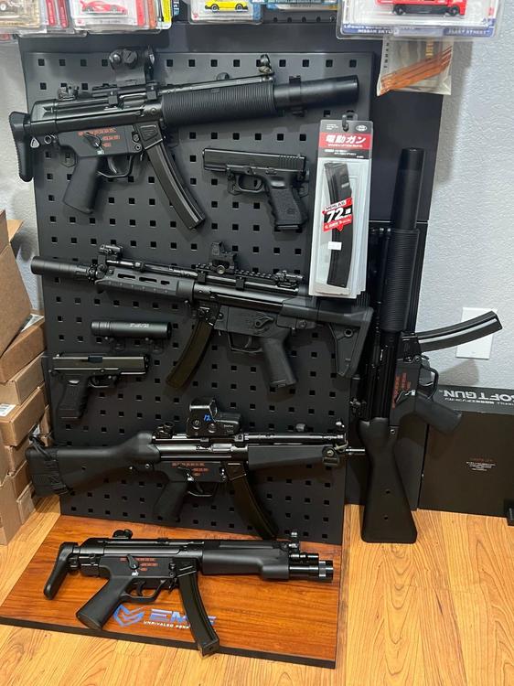 Group shot of the Marui MP5 NGRS collection. Gots the A4, A5, SD6 and put together an SD5 (made from a next Gen A4 and SD6). Other Mp5 is kitted out with Magpul stuff. Finally done buying these things. ? edit: vfc flashlight handguard had a slight front/back play which is annoying as the hole for the pin is oblong-ish. I removed the two strips of plastic to allow for battery space for mounting it on the A5. I cut a small piece from those plastic pieces and glued it at the back of the rear tab (which hook into the upper receiver). No more front-rear play anymore. No creaking. I now use the stock push pin instead of the locking pin that came with my Magpul SL handguard for the mp5.2 points -
