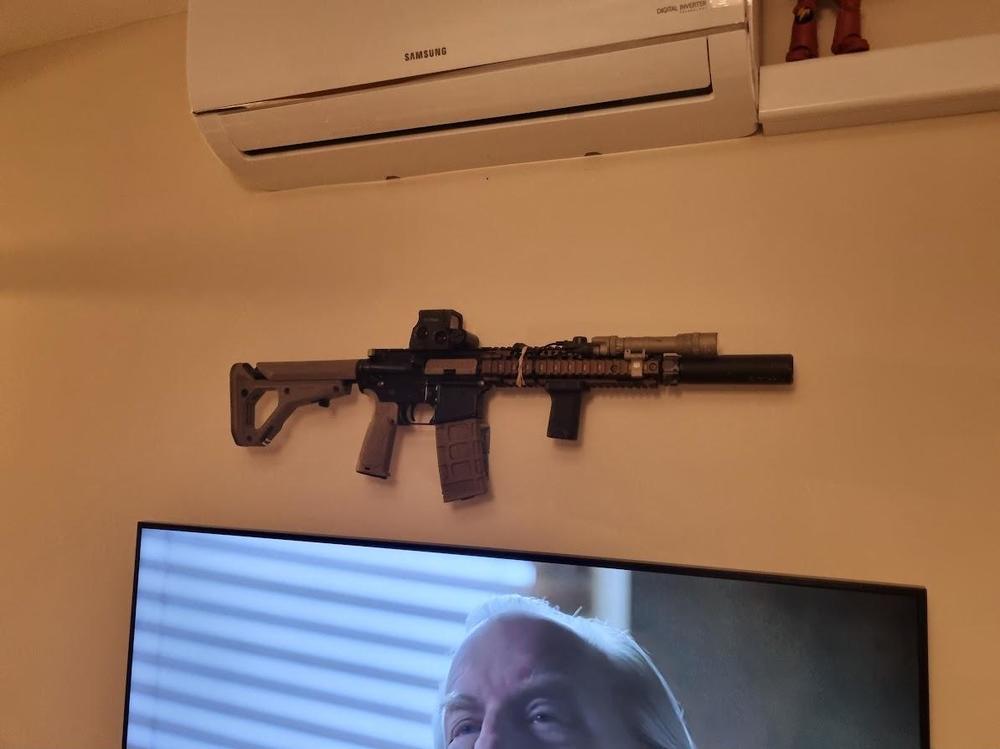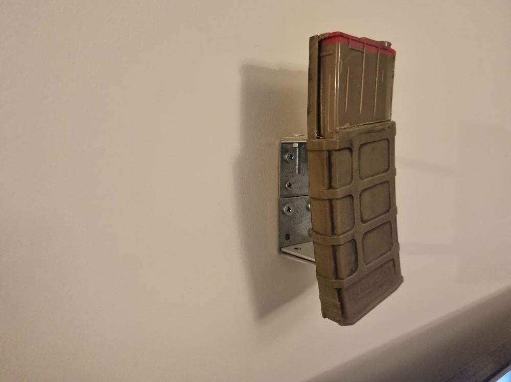 I sailed under a lucky star when the shop opposite me chucked out a load of slatwall. I ran over, asked if they wanted it, then tried to shift if. It's a tad heavy when attached to 18mm MDF! ?? Got it home, all of 50m, put it up and then bought a load of hangers. I need to do a reshuffle at some point as I'm running out of room...have a big ol' basket now for mags as only two of my prws share mags. ???4 points