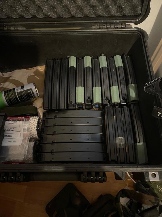 thats.. a lot of mags i have most of my mags in an old ammo crate. i bought the crate from an army surplus stall at my (at the time) local market before lockdowns, stripped off all the old flaking brown paint and resprayed it with some grey primer and army green rattle cans from halfords (which has picked up quite a few scars from other ammo boxes being stacked on top of it) , then my father and i made and painted a pair of wooden divider trays. i swap the mags depending on which backup guns i take to a game day and load the entire crate in the boot of my car.2 points