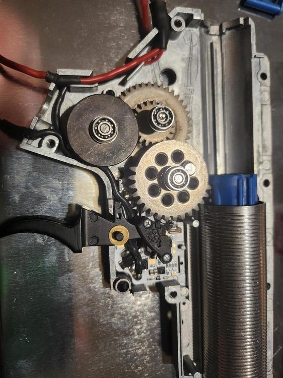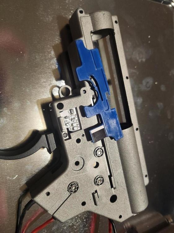 Did the shimming and finished off the perun tasks today. On this gearbox I removed the trigger screw protrusion with a drill bit instead of grinding stuff. The cutoff lever is removed with this perun hybrid. All the scratches are from the manufacturer. The perun sticker I applied after removing the copper and cleaning the plastic with isopropanol. The bearings are 3x8x3 and I had to widen the channel in the selector plate at the top in this pic to take some pressure off the plate so it moves without much effort. Even with 2.5mm ones in the plate rubbed Bearings are from ak2m4, run nicely with thier 7 balls. Obviously better than 6... When I'm finished opening the box I'll lube everything, seems I have a leaky nozzle, the blue, apparently 3d printed, one that came with gun has a texture on it, no o ring and a very strong tappet plate spring which I'll have to compare with some others before I'm happy.1 point