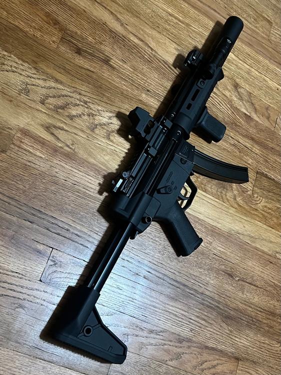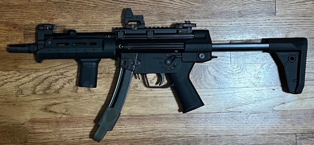 Group shot of the Marui MP5 NGRS collection. Gots the A4, A5, SD6 and put together an SD5 (made from a next Gen A4 and SD6). Other Mp5 is kitted out with Magpul stuff. Finally done buying these things. ? edit: vfc flashlight handguard had a slight front/back play which is annoying as the hole for the pin is oblong-ish. I removed the two strips of plastic to allow for battery space for mounting it on the A5. I cut a small piece from those plastic pieces and glued it at the back of the rear tab (which hook into the upper receiver). No more front-rear play anymore. No creaking. I now use the stock push pin instead of the locking pin that came with my Magpul SL handguard for the mp5.1 point -