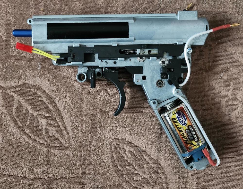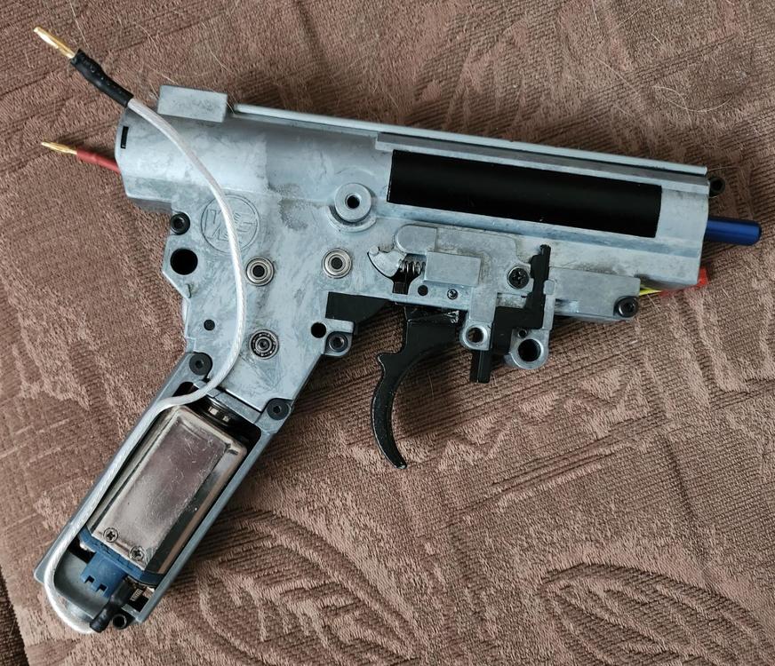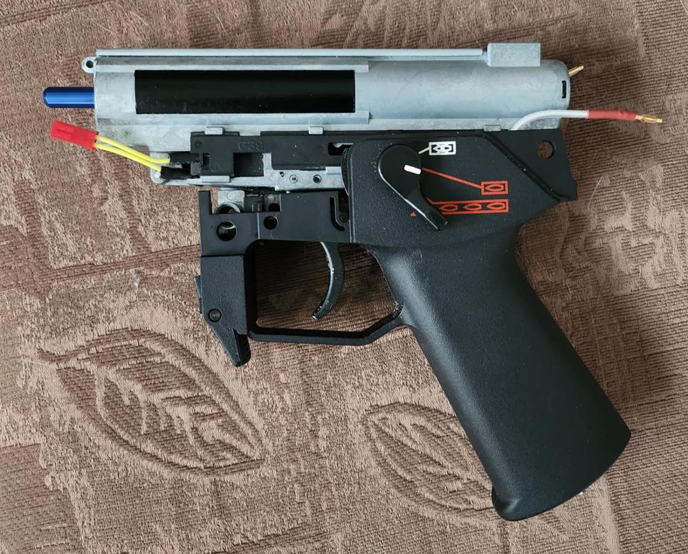 Hello, I fancied a DMR so I thought I would convert my G36k I think it is. There's nothing special going in, just a stronger spring and a simple MOSFET for the trigger. Here's the gearbox, I'll add more as I get on with it. I was able to lock it to semi by using a longer gearbox bolt and adding a nut to the end of it to restrict the selector plate travel. I can use teflon wire with this since I don't need or want the flexibility of silicone. It's thinner too for the same gauge. There's a working bolt cover latch on the model and a reversal latch release on the selection of safety( the black bit just above the motor on pic 1) The battery will be in the front with the MOSFET. Bolt cover catch ahead of the trigger in the above pic. Connectors for the MOSFET trigger in yellow wire and the motor with the bullet connectors at the rear, which will go forward through the body of the gun.2 points -