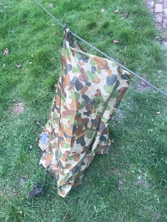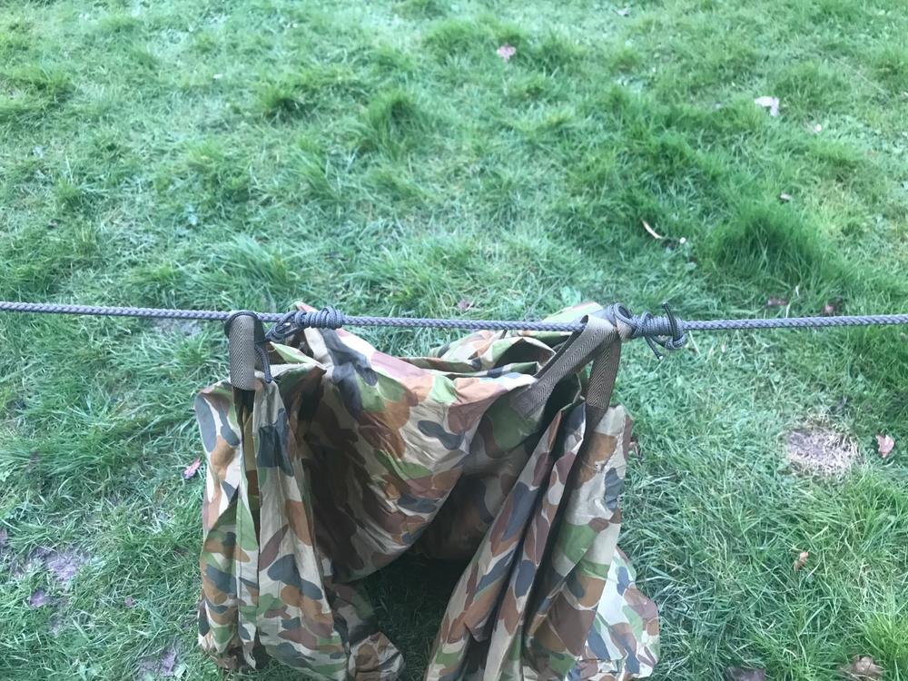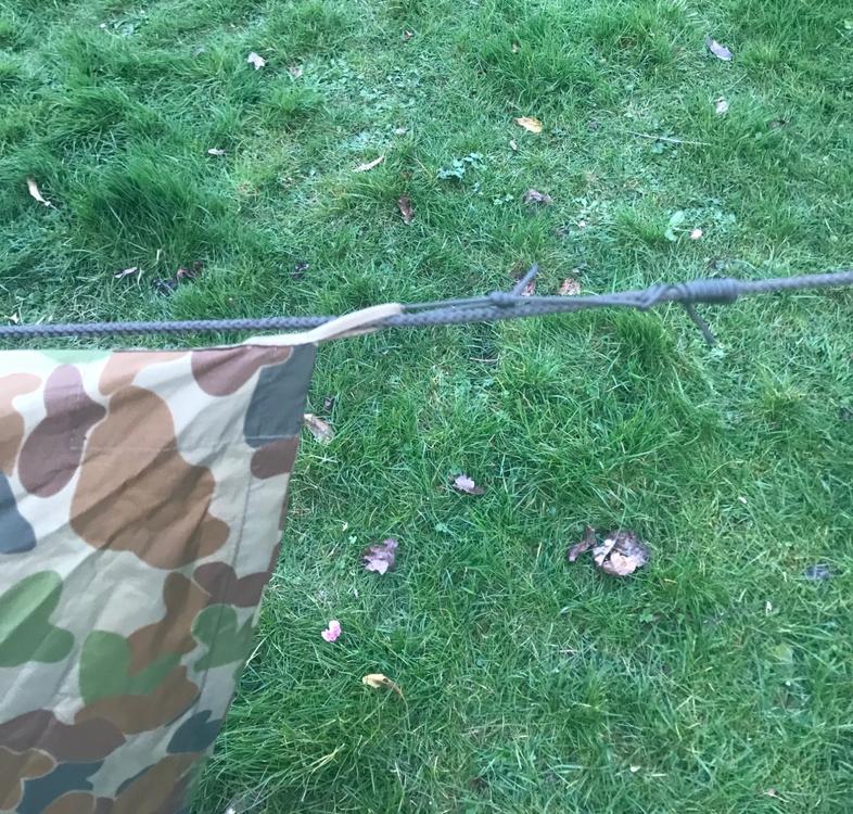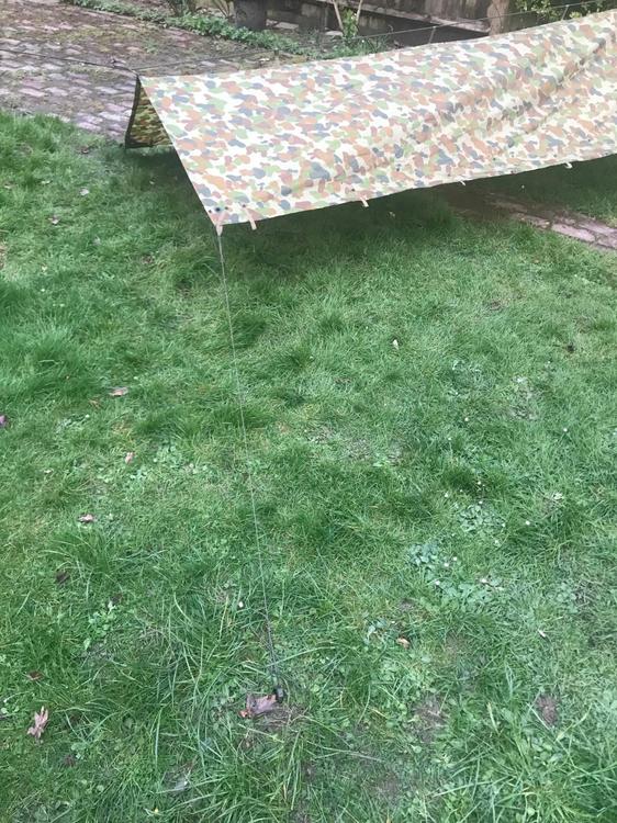 Kelly kettle, now that is decadent sir! Get the tiffin tins and it’s four course meal time. ? I’m going to discuss a couple of shelters setups. Starting with British Army Standard Hotel Accomodation. For skirmishes there’s basically two (non emergency) uses. 1) Weather protection at some sort of harbour area. and/or 2) Concealment for an observation post. I’m a bit wary of tarping over location that will definitely get bumped. Just because I like pyro a lot… ACF YouTube video about the basics. For our purposes quick and easy is what we want. I am not a big fan of bungies however. Mostly because when they go ping they are bound to hit you in the face or nuts. But your mileage may vary! Centre ridgeline basha General use shelter. The setup below is a variation of the basha with the cordage and ridge line already in place. If tying between two trees it uses minimal hardware. Avantage of pre-rigging is that is very quick to pitch. Disadvantage is that you’ve lost some flexibility so as you have to take stuff off to change the set up. Bundled up. Main ridge line is just wrapped around the whole thing. Partly unrolled. You can set this up by tie one end to a tree and unroll it as you go and then trying off the free end. The basha Will the just hang from the line. The line is pretty thick and it easier to work with than paracord. But that works just fine too. The ridge line is pre rigged run through the centre loops on the basha. The knots on the two one loops are PRUSSIK’s. These self lock under load. This means you can tension the basha separately along the ridge line and move it along to where you want it. Staking straight to the ground is the most weatherproof. Using the guy lines gives more clearance. These I quite long as as I often pitch it above a hammock. If I intended to use this for concealment I’d rig the ridgeline along one edge. There are a lot of ways to set up tarps and the Aussie hootch/basha has a variety of eyelets and studs so you can button it into a tube or join them together.2 points -